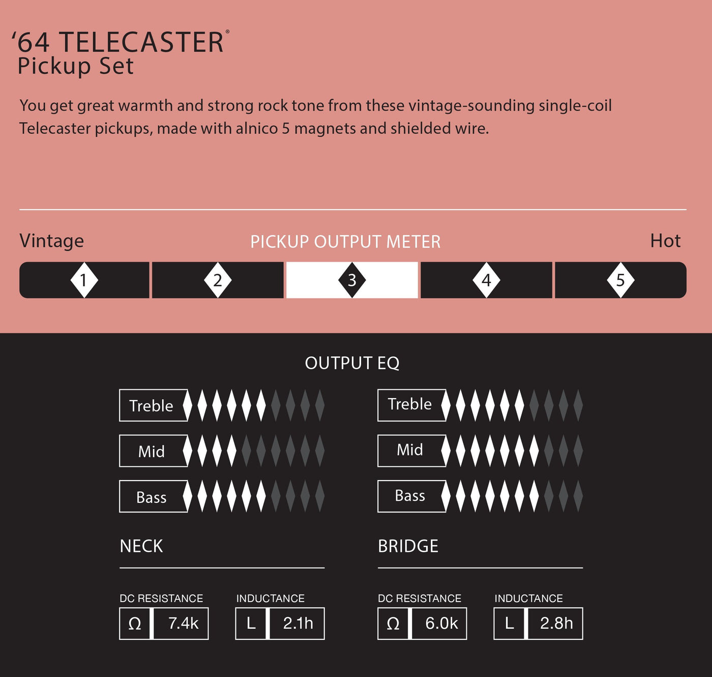 • Q: What type of guitar is compatible with the Fender Pure Vintage '64 Telecaster Pickup Set? A: These pickups are designed specifically for Telecaster guitars and are compatible with most Telecaster models.