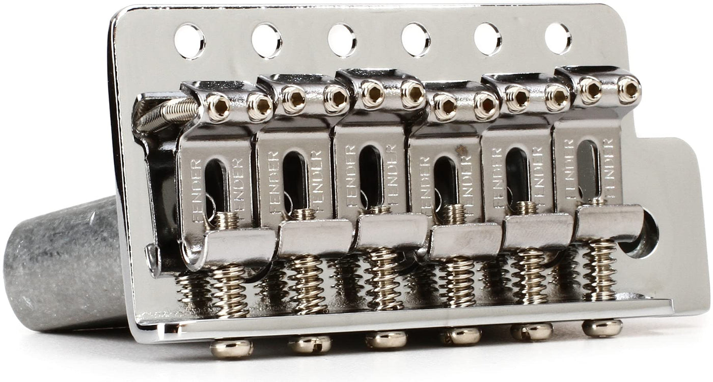- Q: What are the key features of the Fender Electric Guitar Bridge? A: The Fender Electric Guitar Bridge features a nickel-plated steel vintage-style assembly, six bent 'Fender' stamped saddles, intonation screws and springs, and saddle-height adjustment screws. It has a tremolo block that accepts a standard 10/32 thread tremolo arm and features a 2-1/16" bridge mounting spacing.