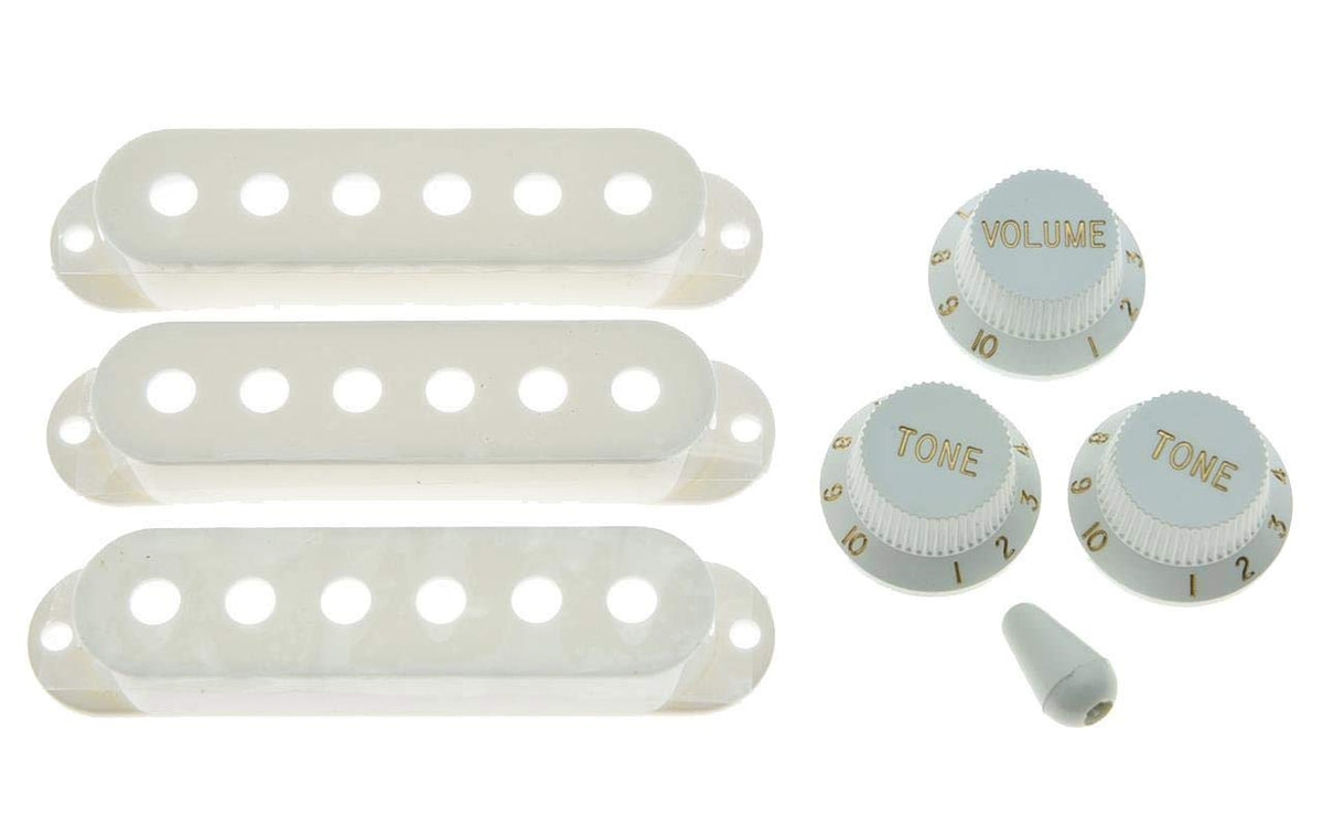 • Q: What colors are available for these parts? A: These specific pickup covers, knobs, and switch tips are available in a classic white color.