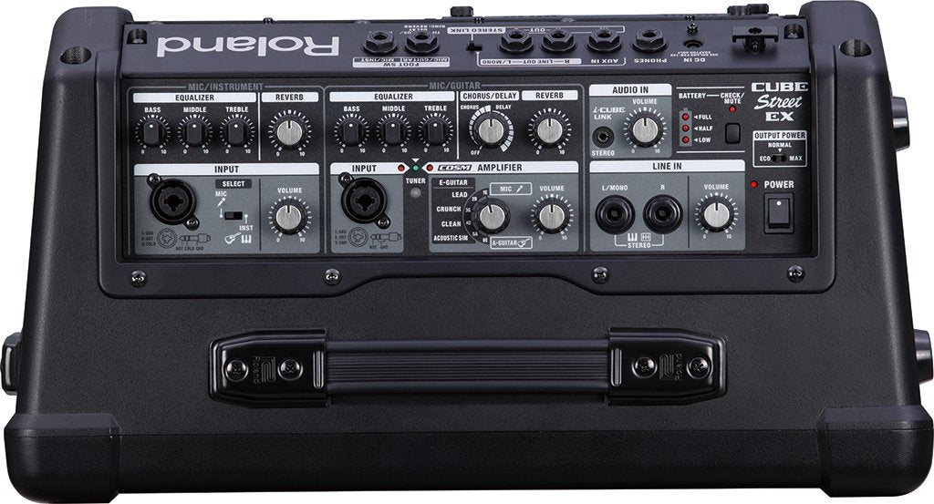 With its compact size and battery-powered operation, RolandAs cUBE Street was a huge hit among traveling musicians Now, the new cUBE Street EX infuses the popular mobile amp with a huge performance upgrade that delivers more projection, more channels, and more versatility 50 big watts of power and a stereo speaker system with dual woofers and tweeters provide clean, punchy sound for larger crowds, while four independent channels offer abundant connections for a variety of mics and instruments Detailed sound adjustment is available with separate EQ and reverb controls, and great guitar tones are dialed in easily with the onboard cOSM amps Selectable power modes provide up to 20 hours of operation with eight AA batteries, and two cUBE Street EX units can be linked together for more sound coverage if needed And with i-cUBE LINK, you can even plug in your iPhone or iPad to play backing music and record your performances