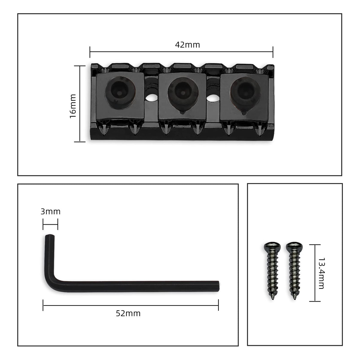 - Q: What dimensions should I consider for string spacing? A: The string spacing for this locking nut is 6.8mm, which is approximately 17/64 inches.