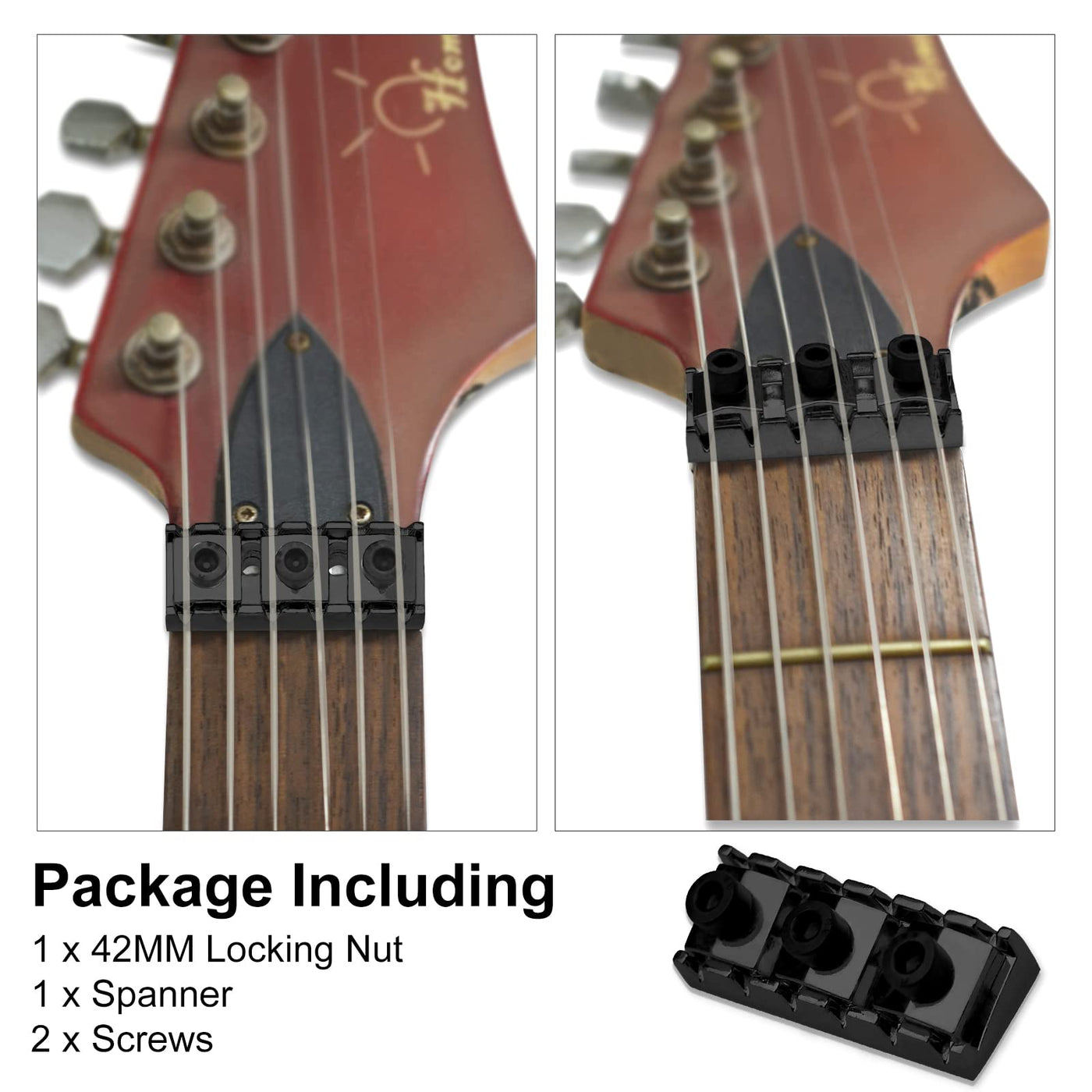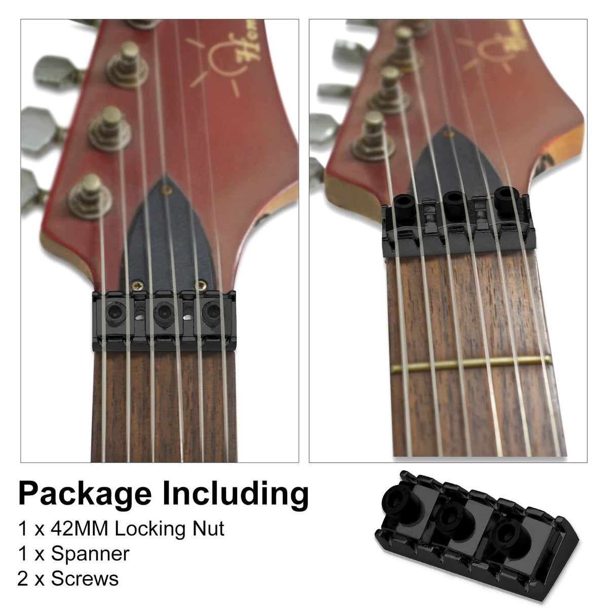 - Q: What type of electric guitars is the SAPHUE 42MM Guitar Tremolo Bridge Locking Nut compatible with? A: The SAPHUE 42MM Guitar Tremolo Bridge Locking Nut is compatible with Floyd Rose style electric guitars and also fits Strat or Squier style electric guitars.