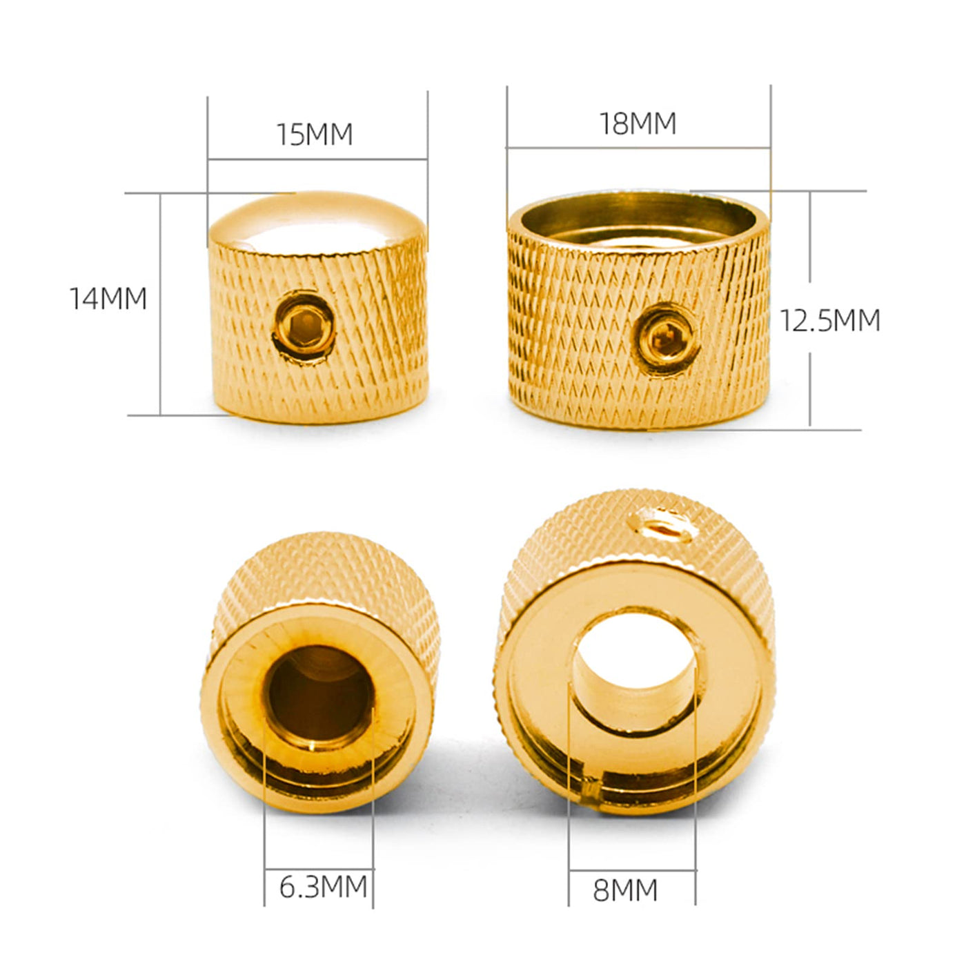 • Q: What are the dimensions of the SAPHUE Guitar Dual Concentric Knobs? A: The top knob size is 14mm x 15mm, compatible with 6.3mm shaft pots, while the base knob size is 12.5mm x 18mm, compatible with 8mm shaft pots.