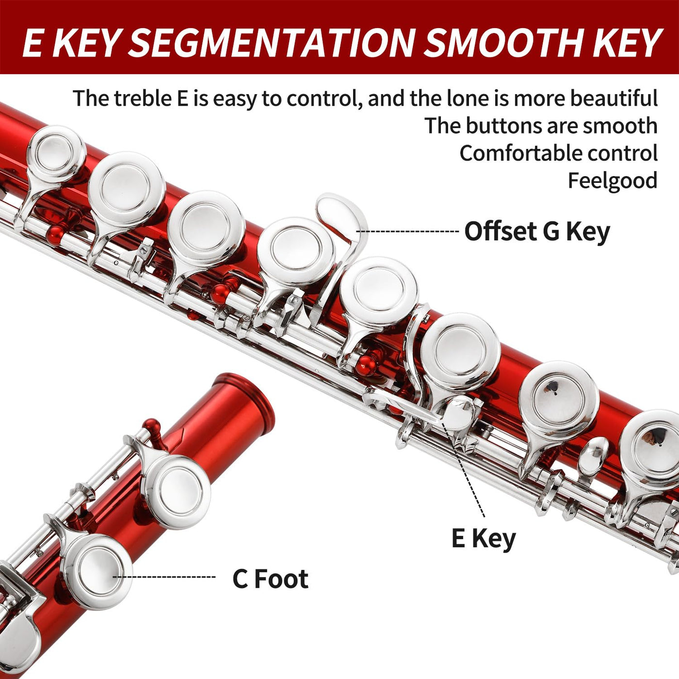 - Q: What features enhance the playability of this flute? A: The flute features a closed hole design, an offset G key, split E key, and professionally padded keys with steel springs for improved playability.