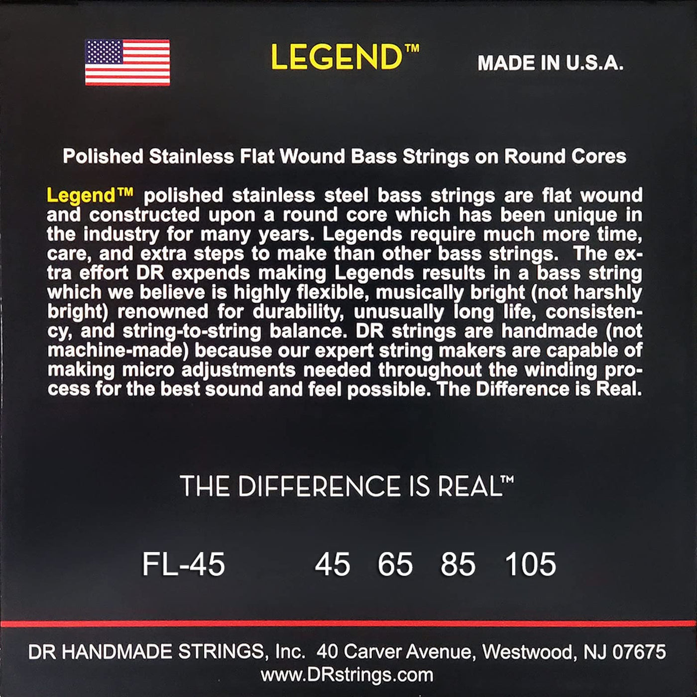 • Q: What are DR Strings Legend Polished Flatwound Bass Strings made of? A: These bass strings are made of polished stainless steel, which provides a smooth feel and contributes to their warm tone.