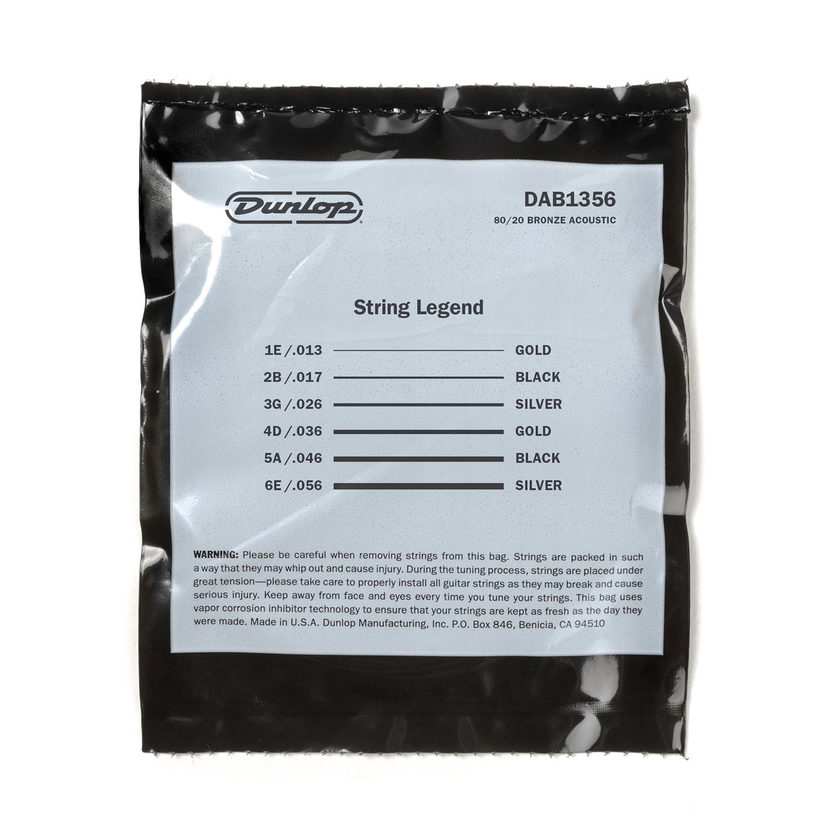 - Q: What are the gauge sizes of the Jim Dunlop Acoustic Guitar Strings? A: The Jim Dunlop Acoustic Guitar Strings come in the following gauge sizes: .013, .017, .026, .036, .046, and .056.
