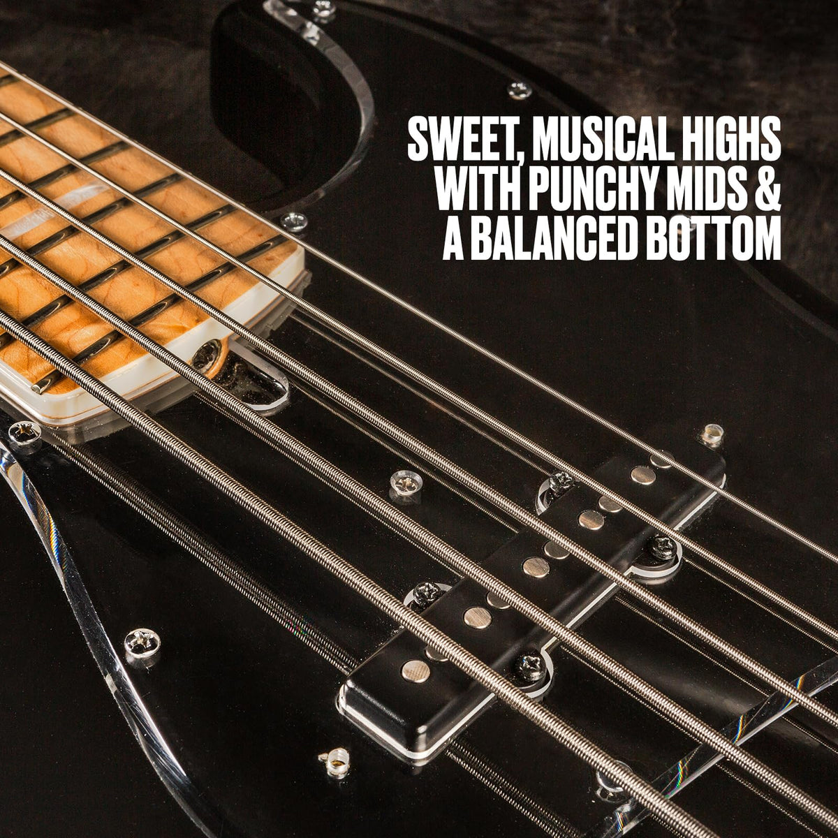 - Q: What sound characteristics can I expect from these strings? A: You can expect a crisp, vibrant top end with a fat bottom and focused fundamental, delivering clear and defined highs supported by a balanced low end.