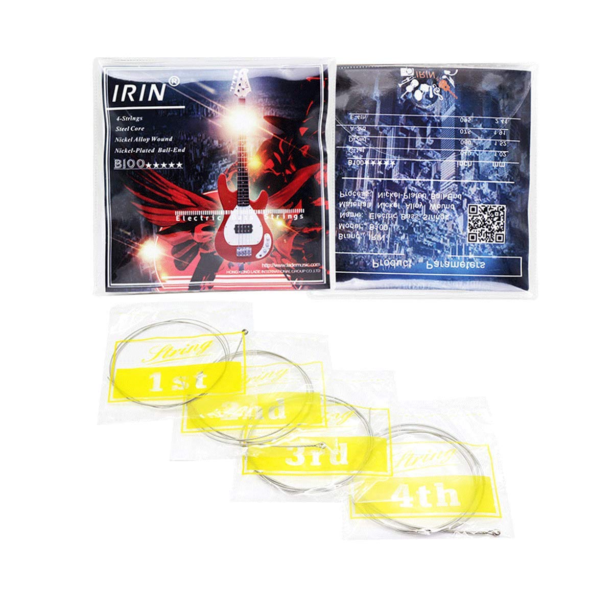 • Q: What is included in the package of JYsun Electric Bass Strings? A: The package includes one full set of electric bass strings (4 pieces), one blue cleaning cloth, and five guitar picks.