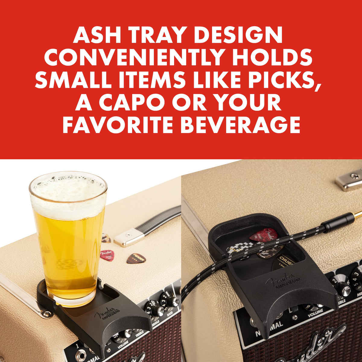 - Q: Does the Amperstand Cradle have compartments for accessories? A: Yes, it includes a classic Fender 'ashtray' design that conveniently holds small items like picks, a capo, or even a beverage.