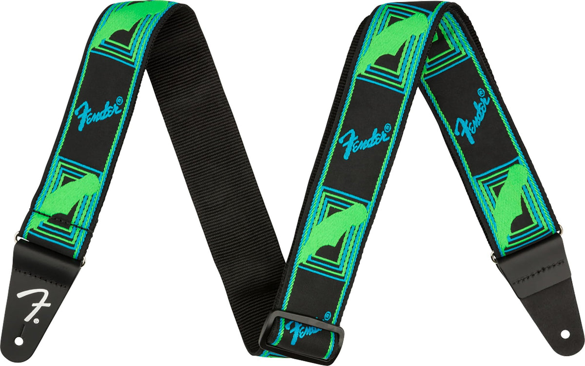 Fender Neon Monogrammed 2-Inch Guitar Strap - Blue and Green Bundle with Strap Blocks and Picks