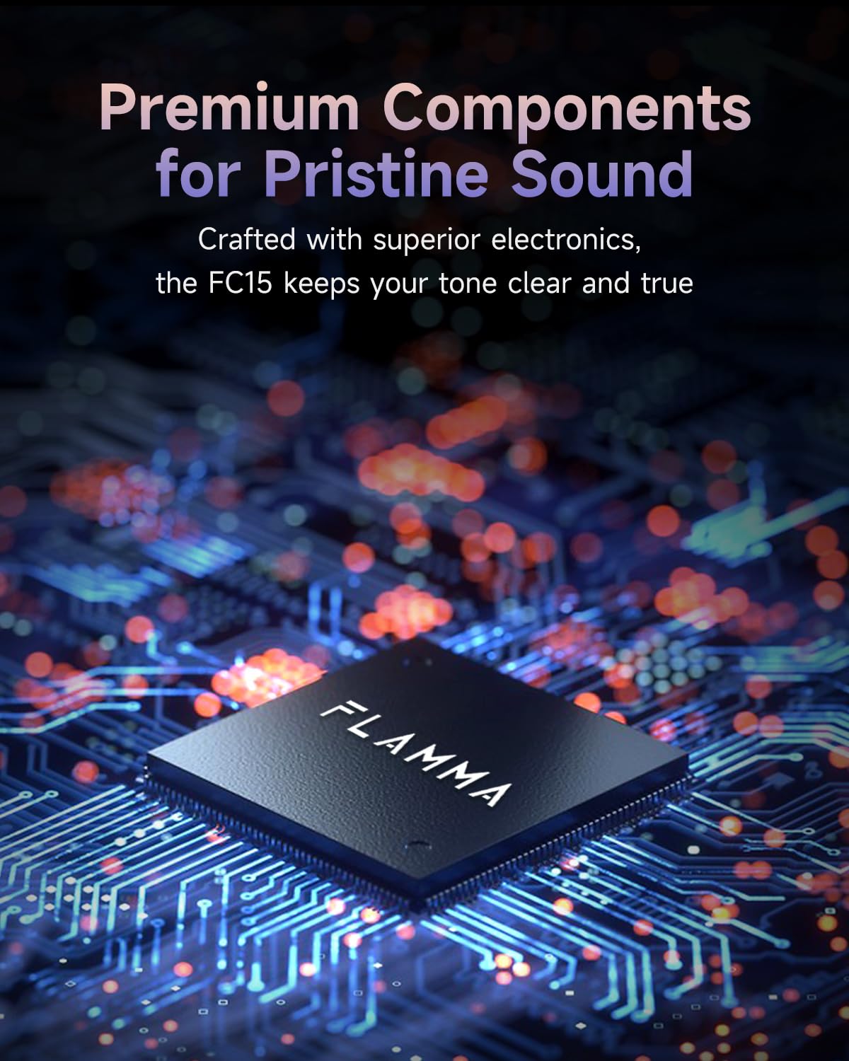 - Q: Can the FLAMMA FC15 be used with any guitar? A: Yes, the FLAMMA FC15 is compatible with electric guitars and can be used with various amp setups.