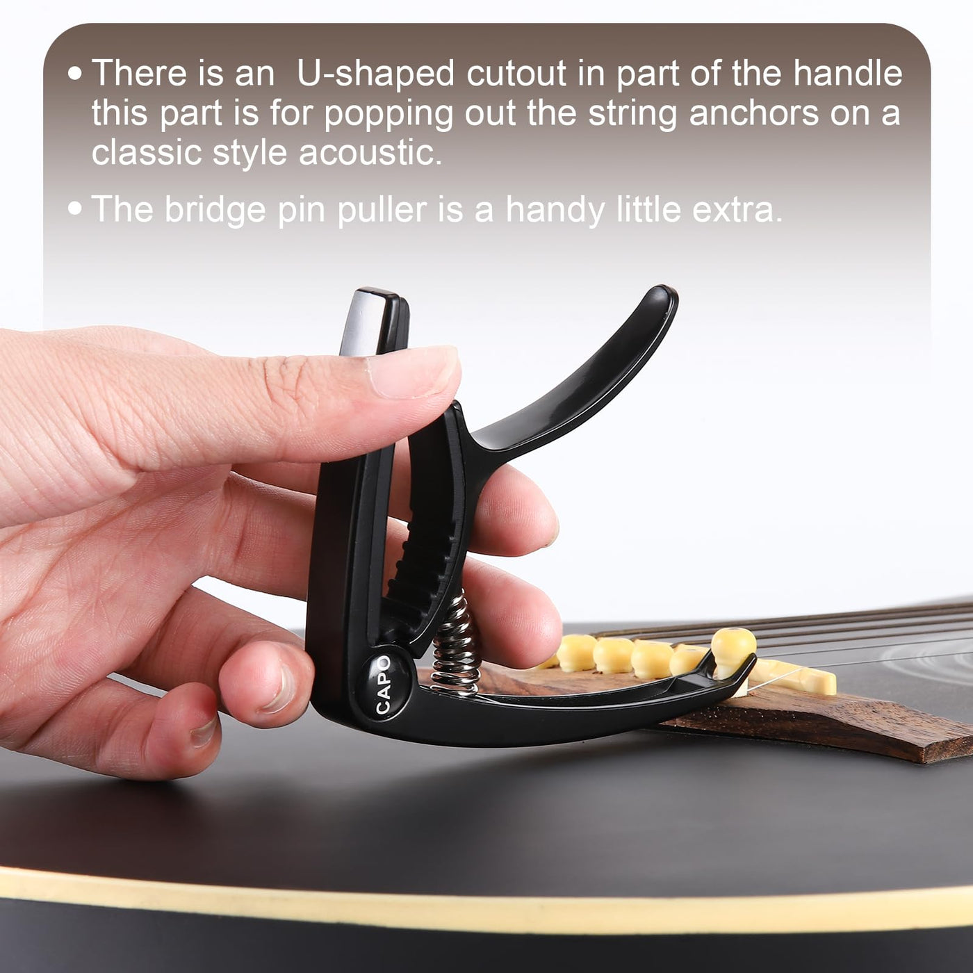 - Q: Does the capo have any additional features? A: Yes, it includes a bridge pin puller, a handy tool for acoustic guitar players.