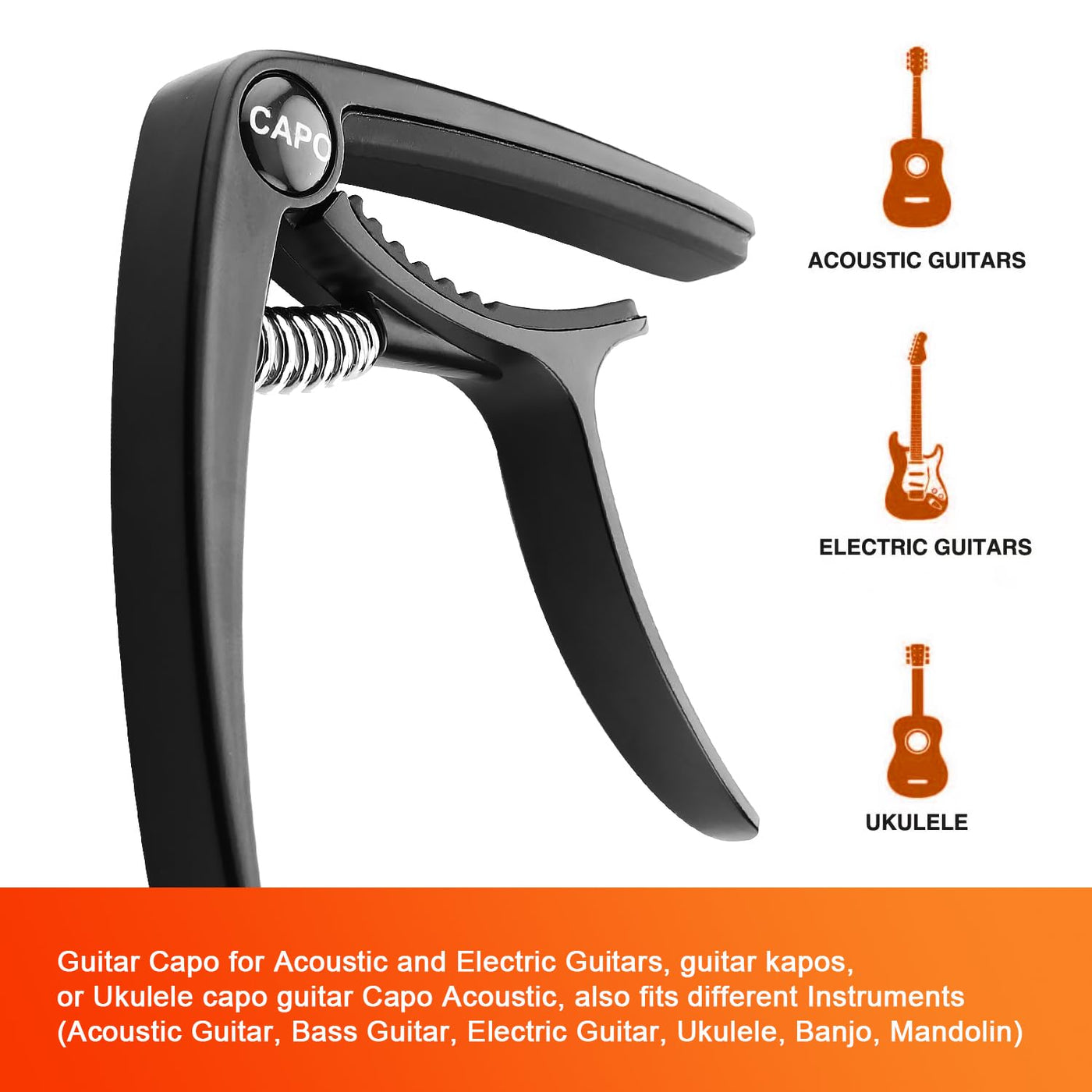 • Q: Is this capo suitable for both acoustic and electric guitars? A: Yes, this capo is designed to work with both acoustic and electric guitars, as well as other string instruments like ukuleles and banjos.