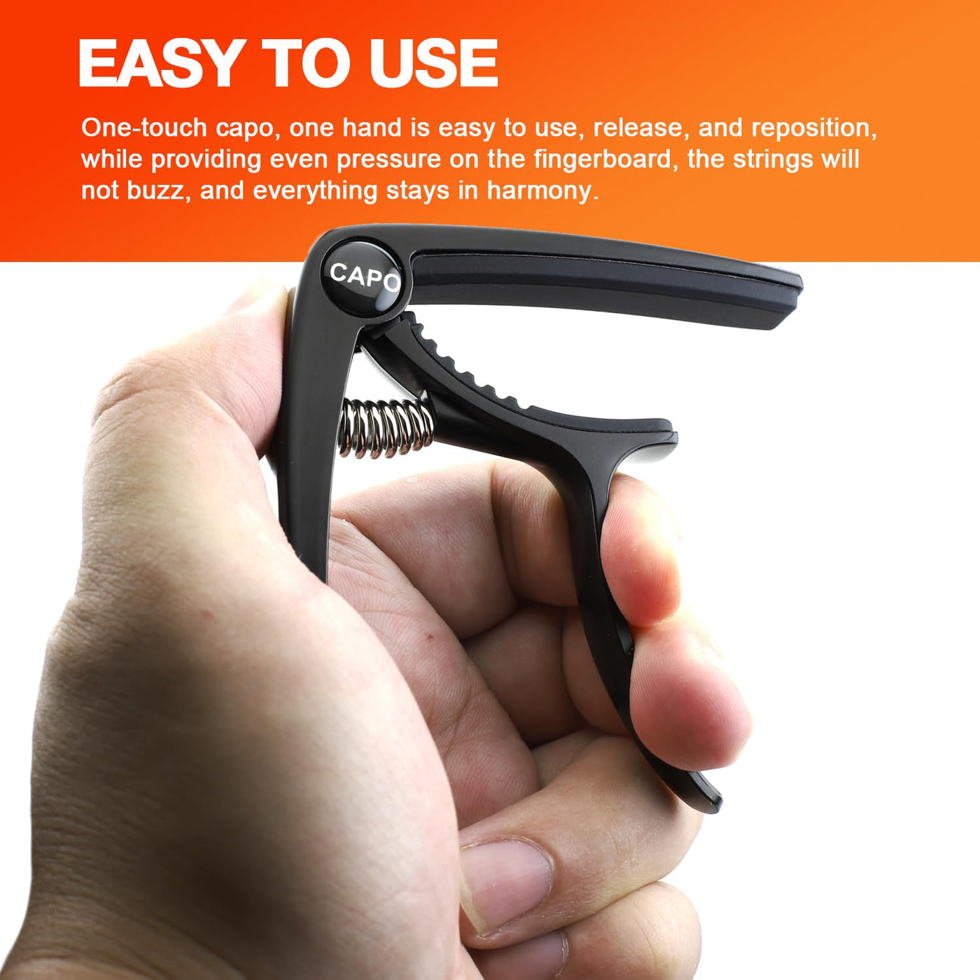 • Q: How easy is it to use this capo? A: This capo is designed for one-handed operation, making it easy to attach, release, and reposition without needing extra help.