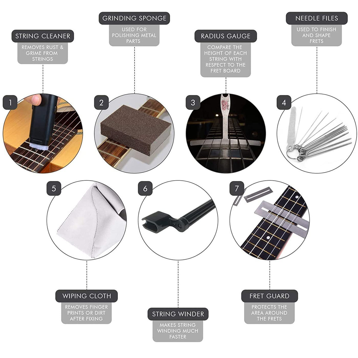 - Q: What is included in the Guitar Repairing Maintenance Tool Kit? A: The kit includes 72 pieces such as 8 Allen wrenches, 2 fretboard protectors, 9 understring radius gauges, 10 fret crowning luthier files, 5 guitar picks, 6 guitar strings, various bridge components, needle files, string tools, and a guitar fretboard sticker.