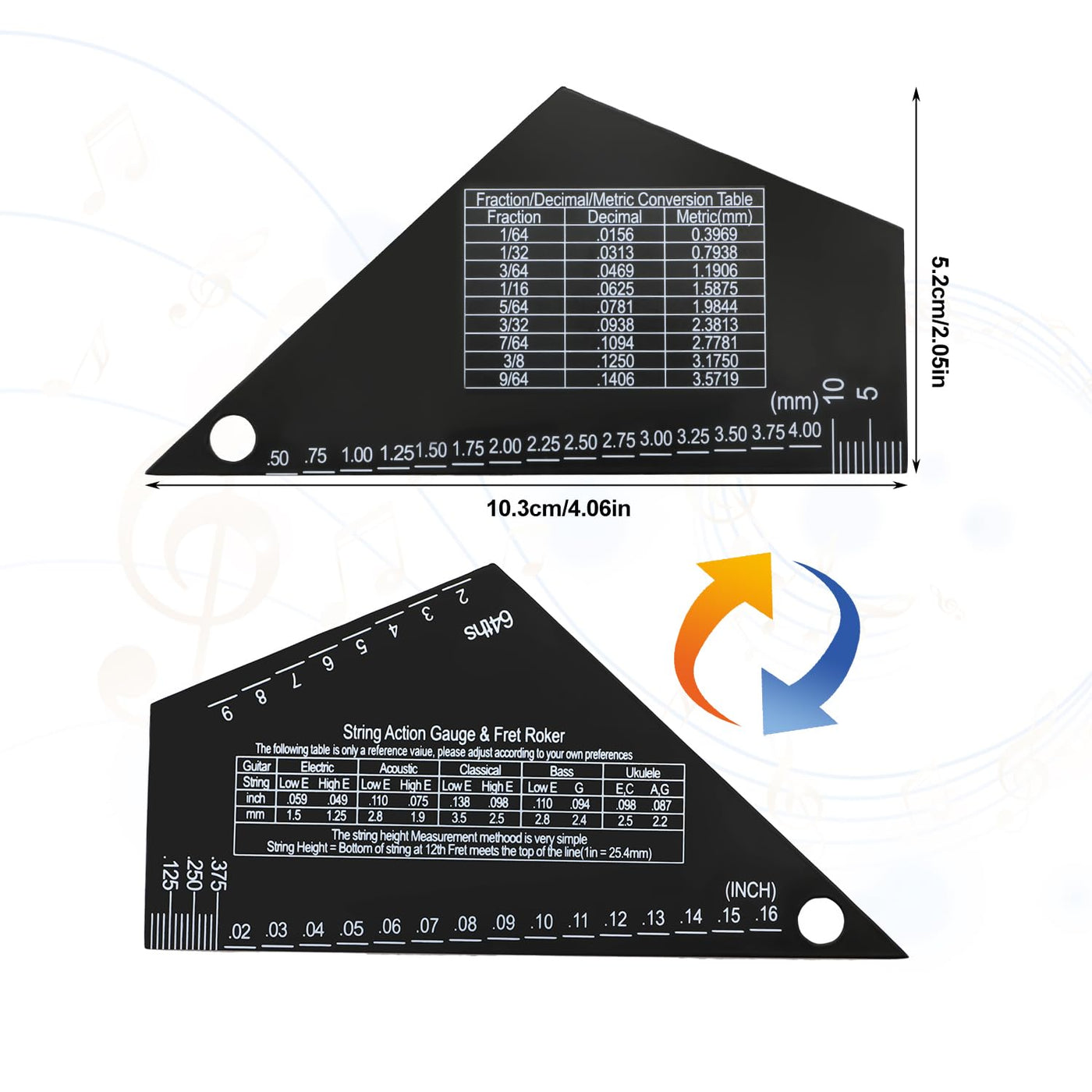 - Q: How do I read the measurements on the gauge? A: The gauge features a matte black surface with white printed scales and conversion tables, allowing for easy readability without light reflection. Simply align the desired measurement mark with the string or fret to get an accurate reading.