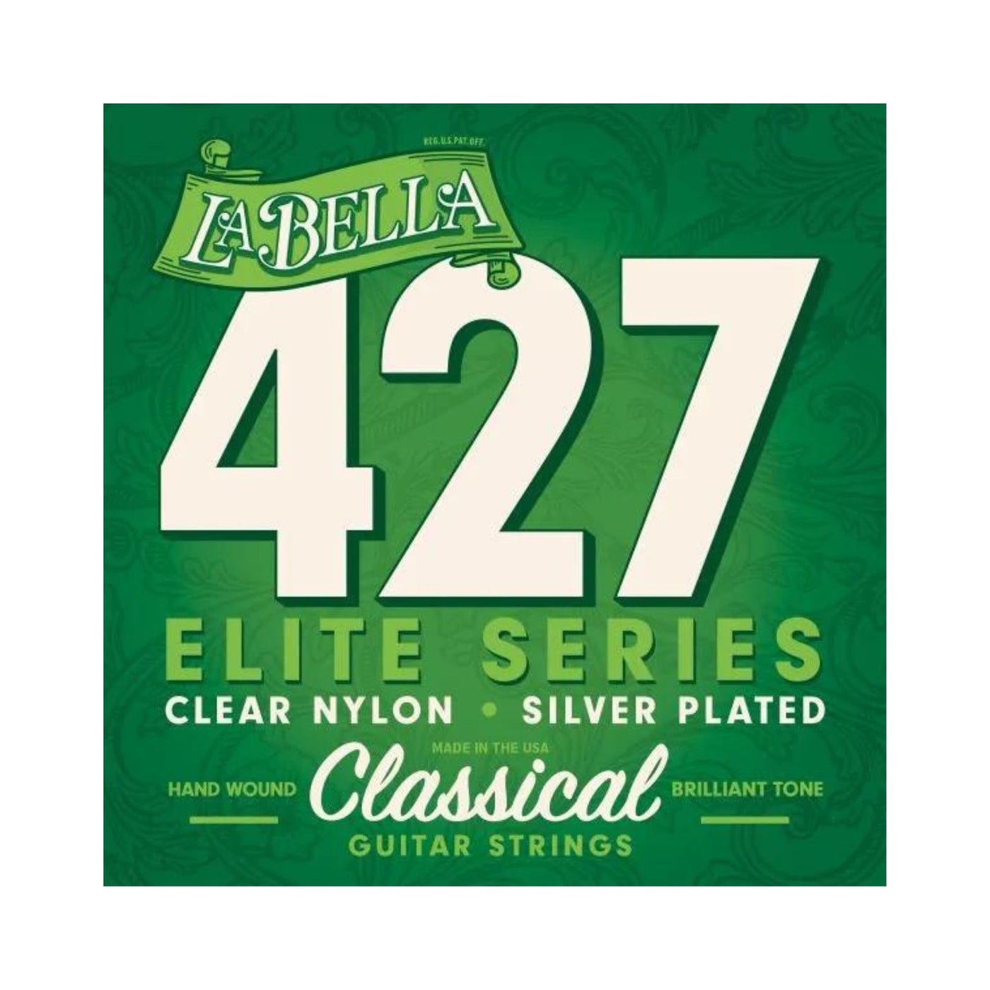 • Q: What are La Bella 427 Elite Series Guitar Strings made of? A: The La Bella 427 Elite Series Guitar Strings are made with clear nylon for the trebles and silver-plated copper for the wound bass strings, which are wrapped around a nylon filament core.