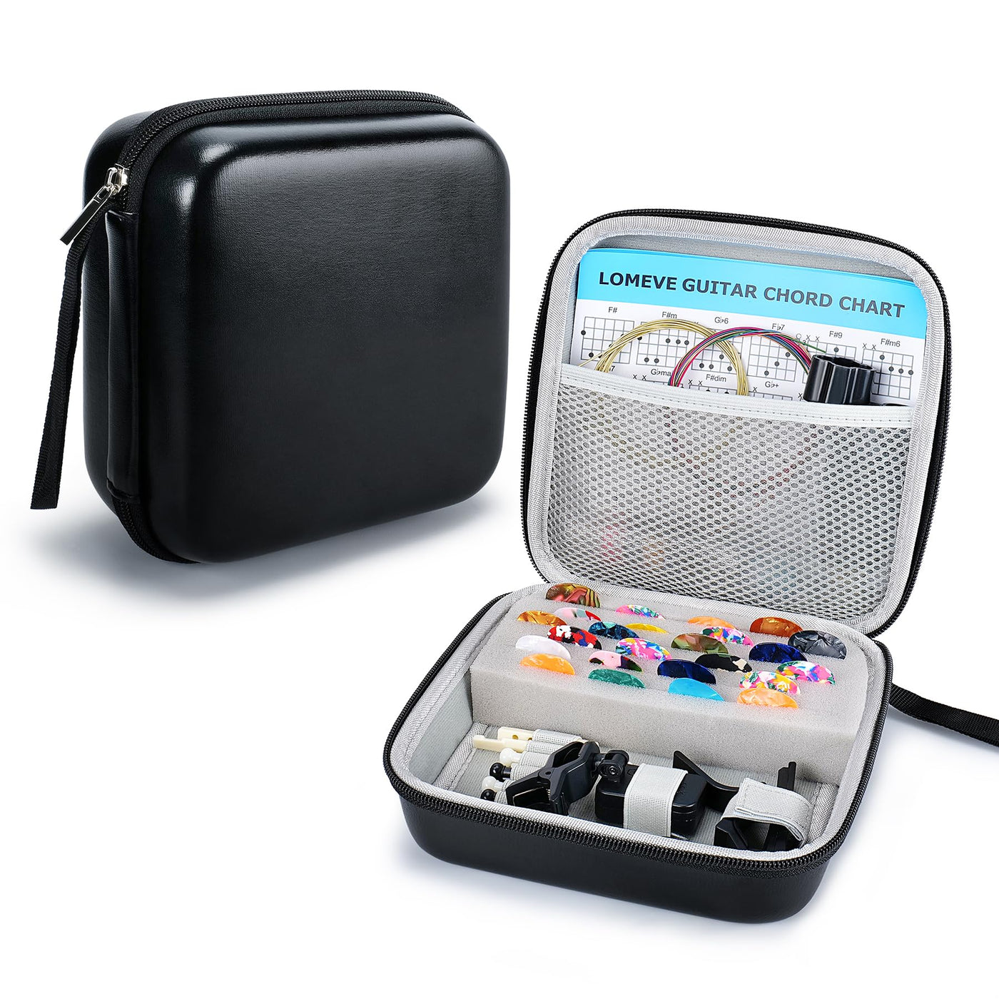 - Q: How does the guitar pick holder work? A: The guitar pick holder is designed with soft inner foam cutouts that securely fit your picks, protecting them from scratches and dust.