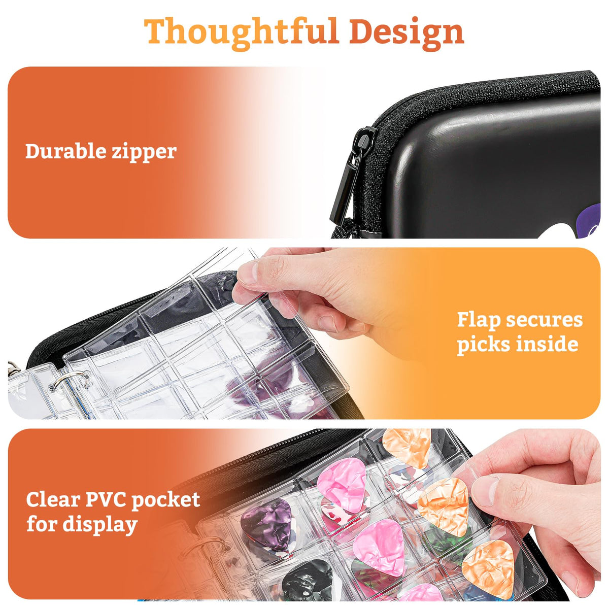 • Q: Does the case prevent guitar picks from getting lost? A: Yes, each pocket in the case features a flip cover designed to prevent pick loss and keep your picks secure.