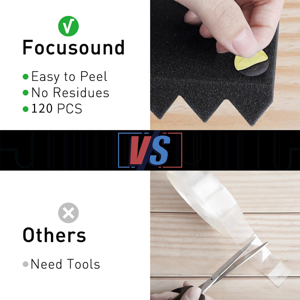 - Q: How do I install the acoustic foam panels? A: Installation is simple; each panel requires 5 pieces of tape. Apply the tape to the back of the panel and stick it to the desired surface.