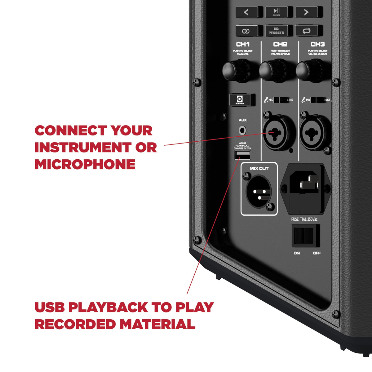 - Q: Does the Trouper 100 have a built-in mixer? A: Yes, the Trouper 100 features a built-in 3-channel mixer with dedicated main volume control and two combo XLR inputs for microphones and instruments.