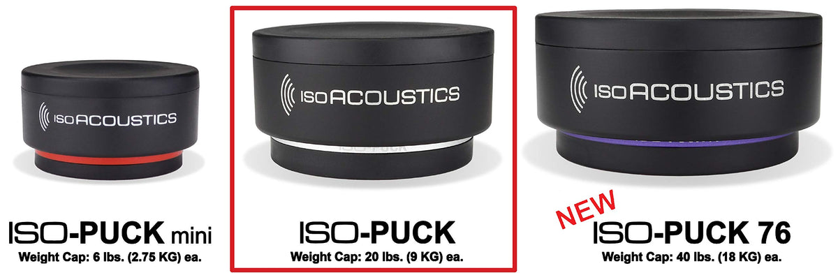 • Q: What is the weight capacity of each IsoAcoustics ISO-Puck? A: Each IsoAcoustics ISO-Puck has a weight capacity of 20 lbs (9 kg) per unit.