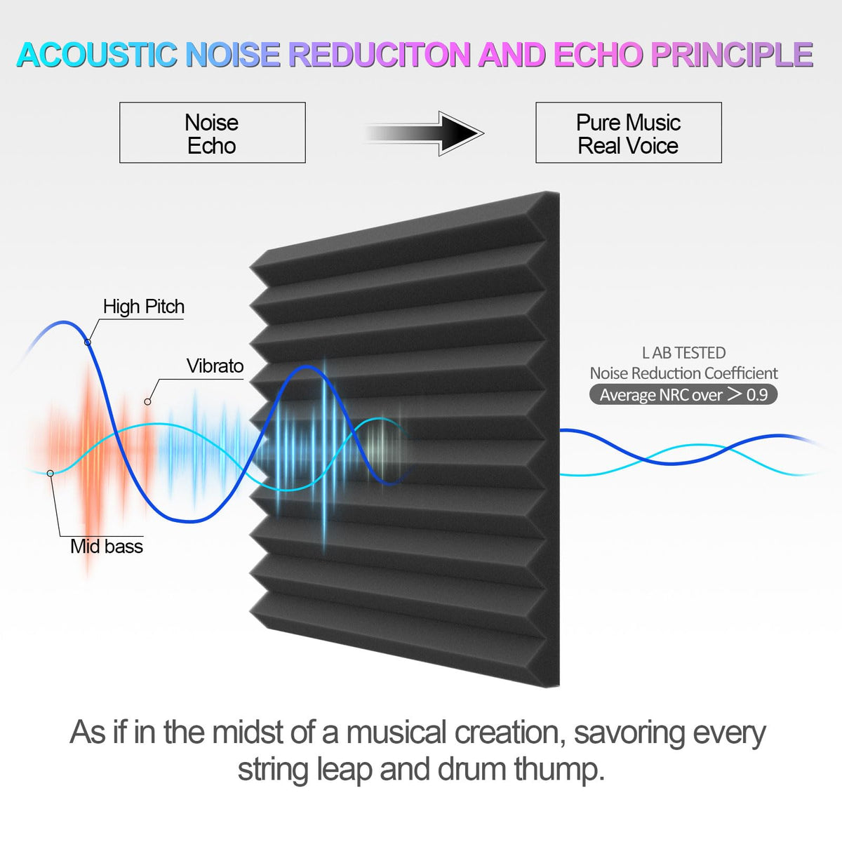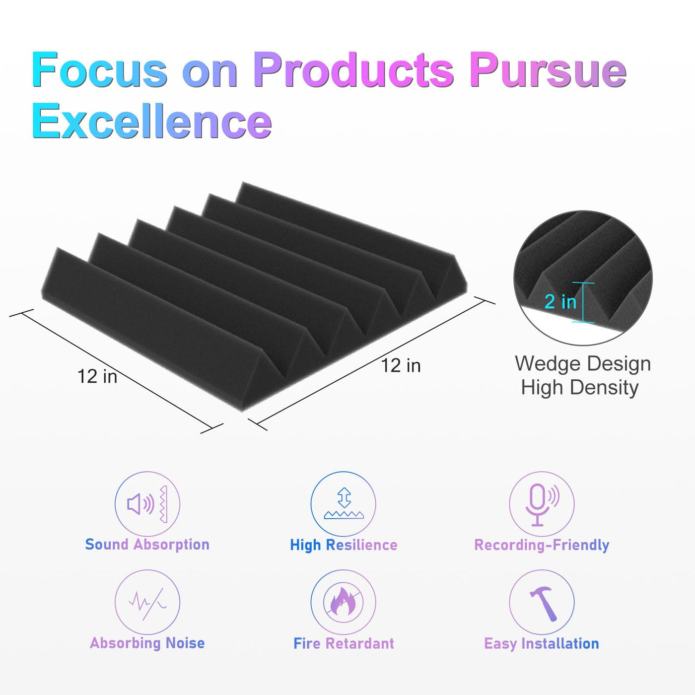 - Q: What are the dimensions of each acoustic panel? A: Each acoustic panel measures 2 inches thick and 12 inches by 12 inches in size.