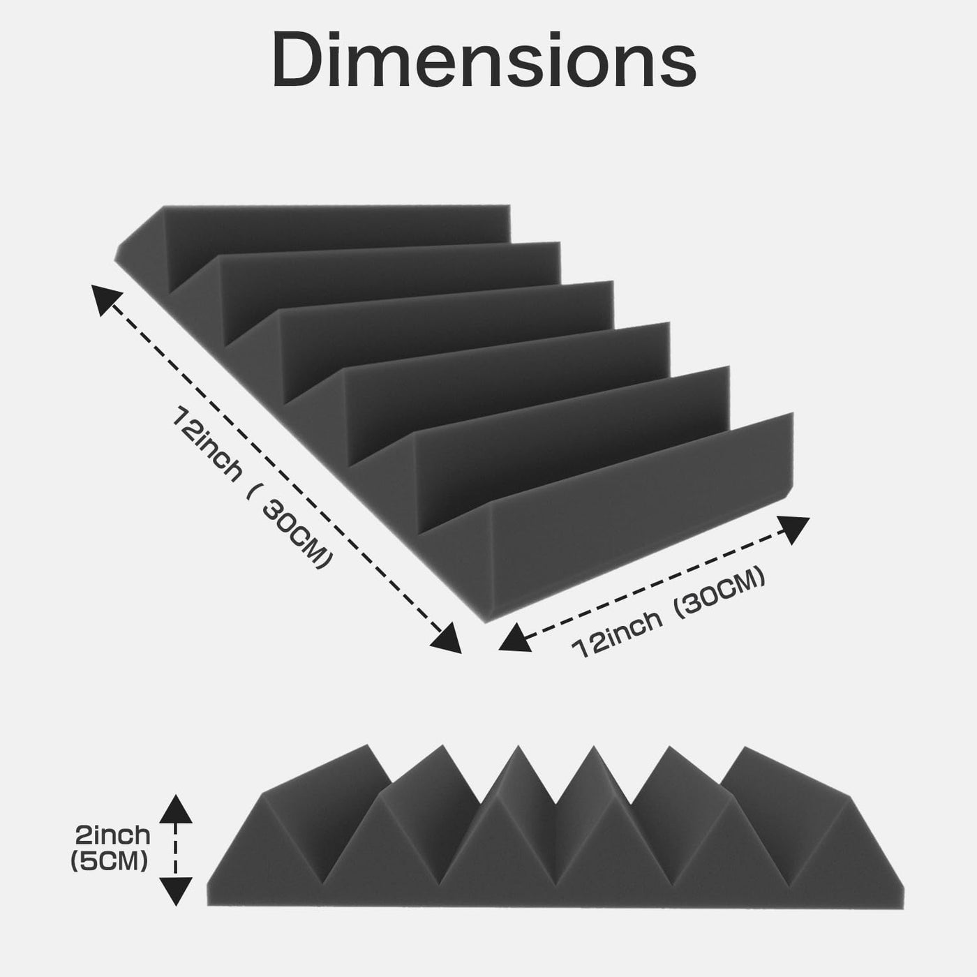 • Q: What are the dimensions of each acoustic panel? A: Each panel measures 2 inches in thickness and 12 inches by 12 inches in width and height.