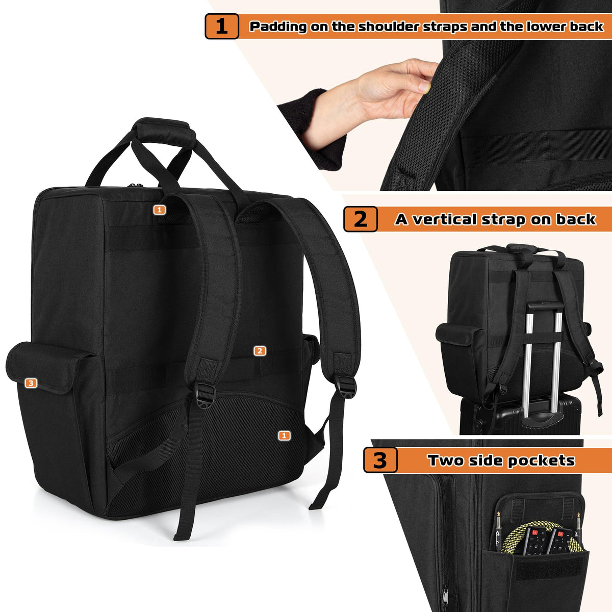 - Q: Are there any additional pockets for accessories? A: Yes, the front section includes various pockets for charging cables, remote controls, and other electronics, along with two side pockets for cords.