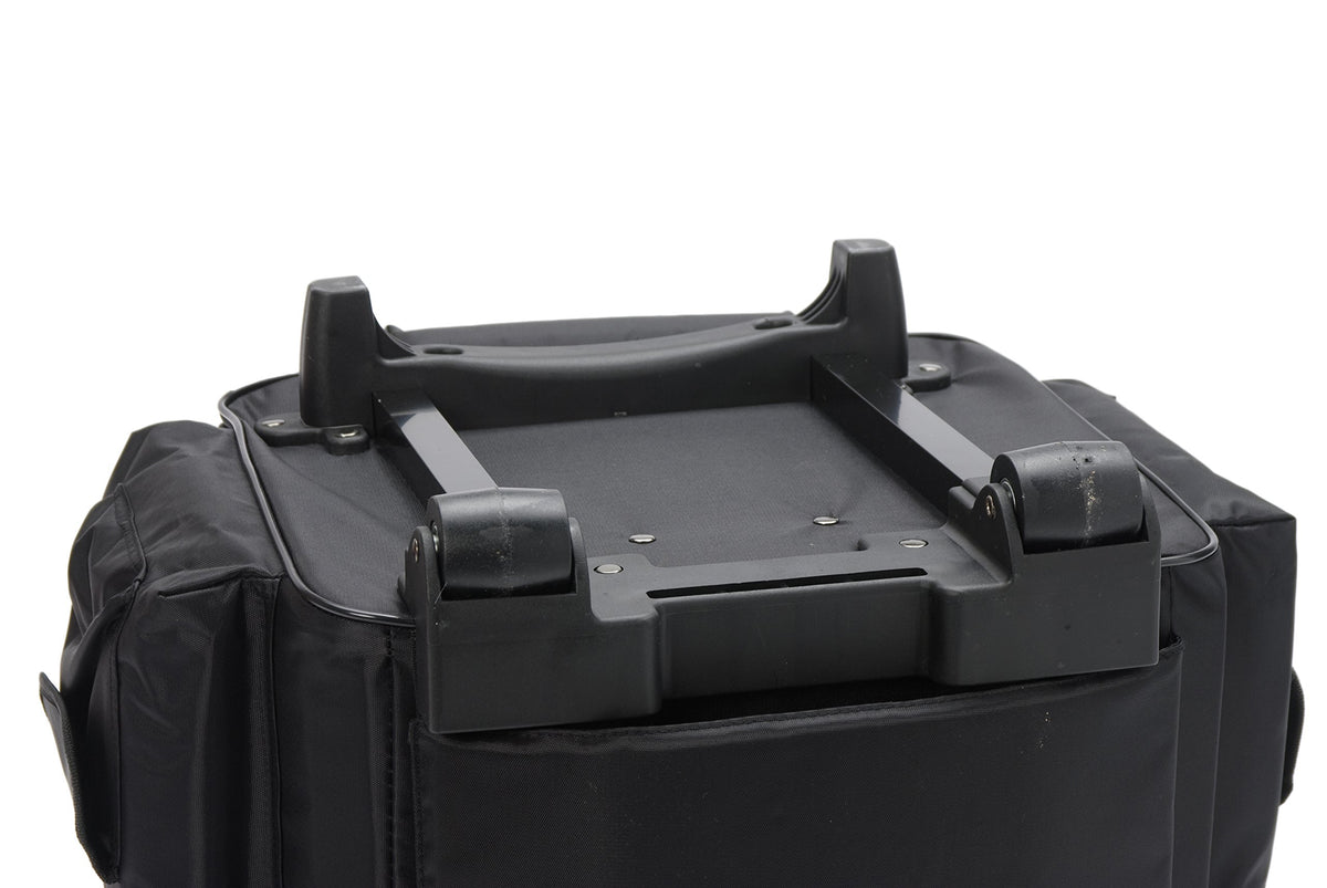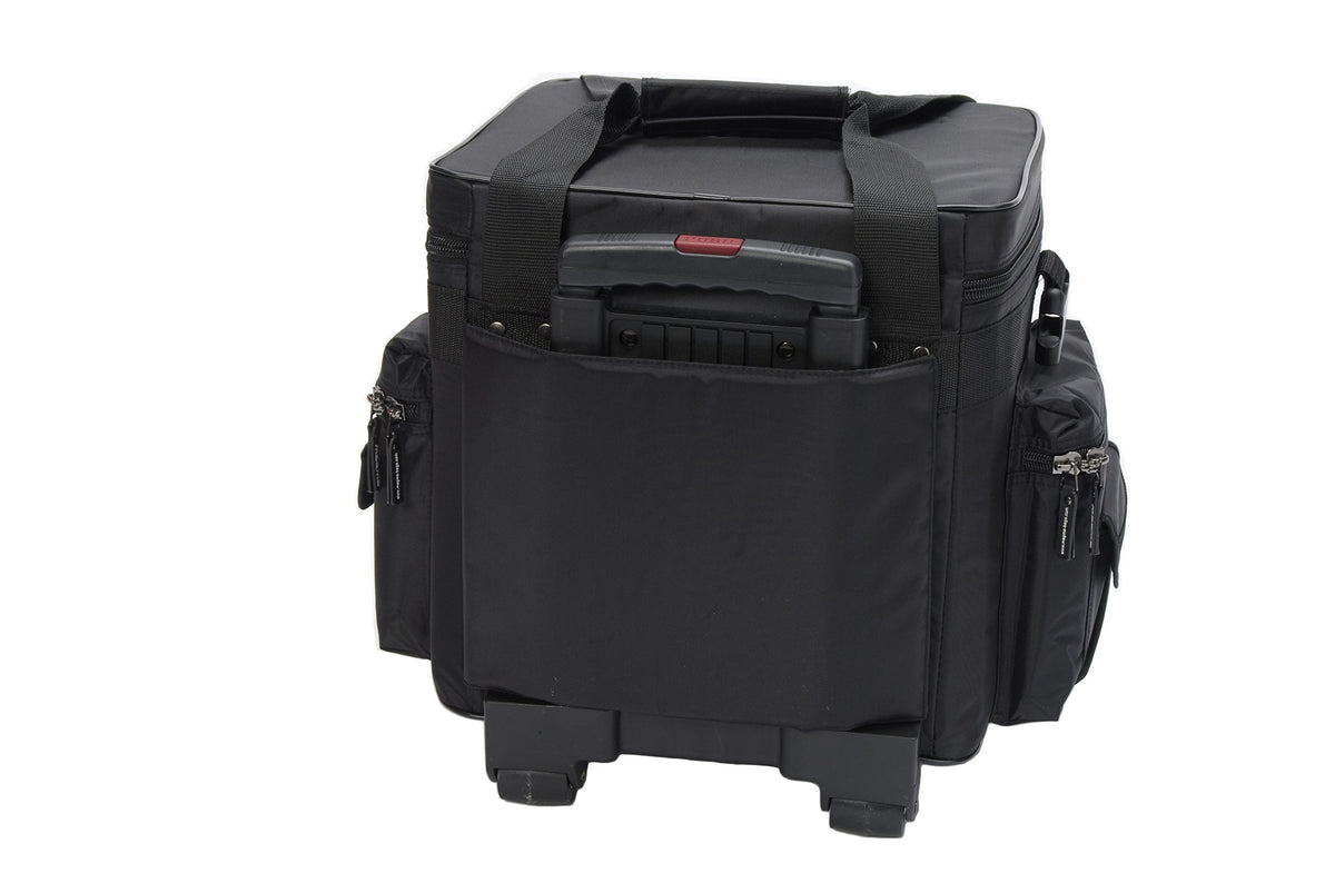 The Magma LP Bag 100 Trolley offers a practical and convenient way to carry up to 90 LP records. It features a robust trolley-board system with telescopic handle, and sturdy rubber feet to make sure the bag is always balanced. We know records weigh a ton, so the LP Bag 100 Trolley has reinforced panels and one inch extra thick padding all around. The back wall includes even more padding to make sure the trolley handle and records are equally protected. The bag is made from durable, water-repellent nylon with high quality zippers. There will be times when you need to pick the trolley up off the ground. You should never lift from the trolley handle, that's we why the LP Bag 100 Trolley also features comfortable carrying handles and a removable padded shoulder strap. Your records will be well protected anywhere you go with the Magma LP Bag 100 Trolley.