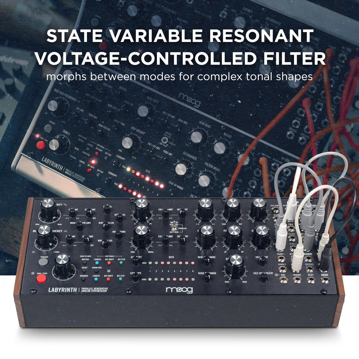 - Q: What unique features does the MOOG Labyrinth synthesizer offer? A: The MOOG Labyrinth synthesizer includes a dual sequencer, dual oscillators, a voltage-controlled wavefolder, and a voltage-controlled filter. It allows for unique sound manipulation with its comprehensive patch bay and chance operations that create evolving sequences.
