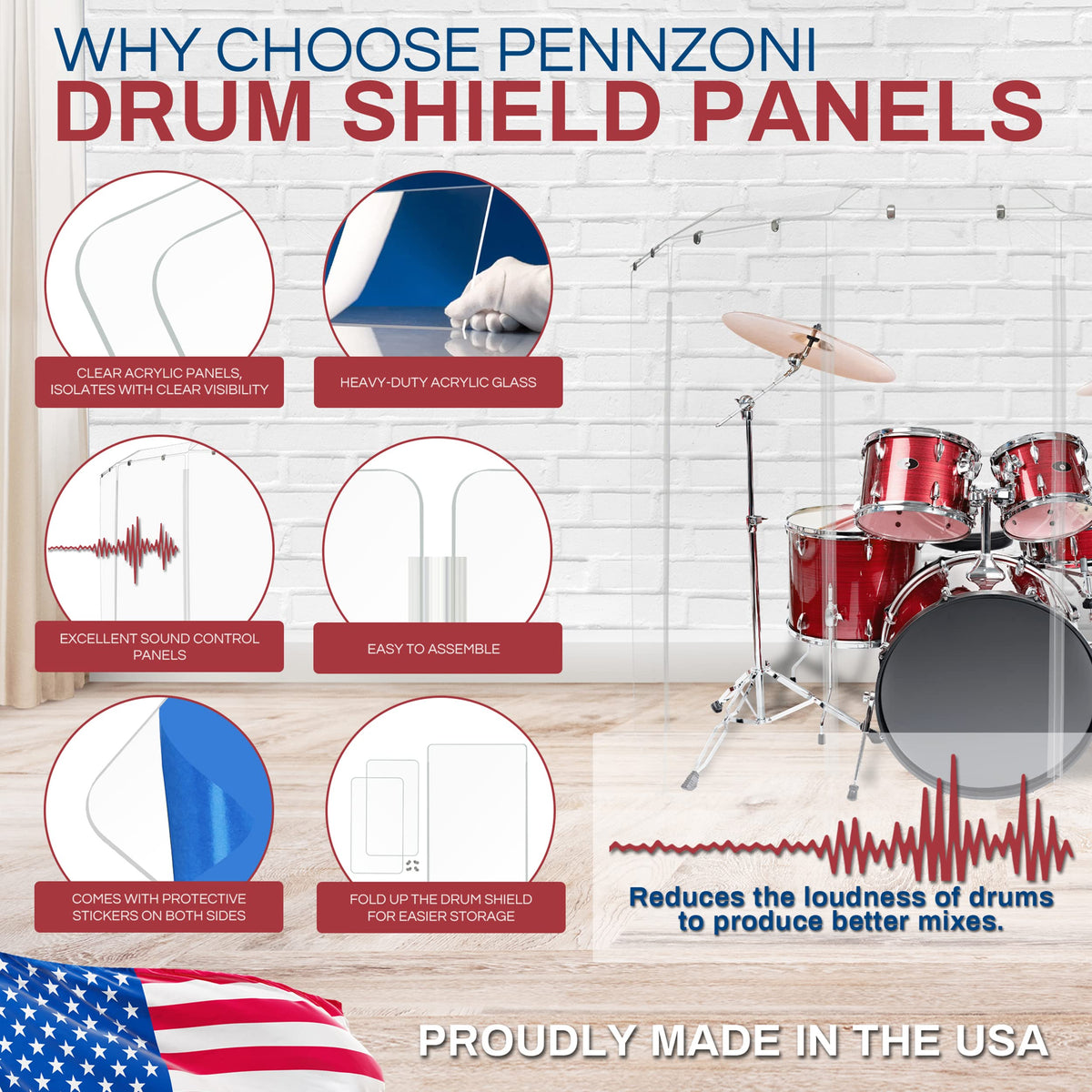 - Q: What materials are used in the construction of the Pennzoni Drum Shield? A: The drum shield is made from ¼" thick crystal clear acrylic, which provides excellent sound control while maintaining visibility.