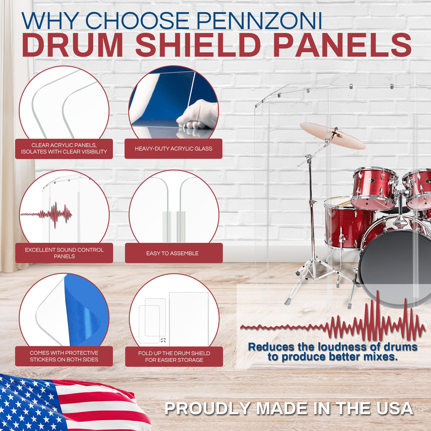 - Q: How does the drum shield improve sound quality? A: The Pennzoni Drum Shield helps control volume and isolates drum sounds, allowing for better live mixes and harmony with other instruments.