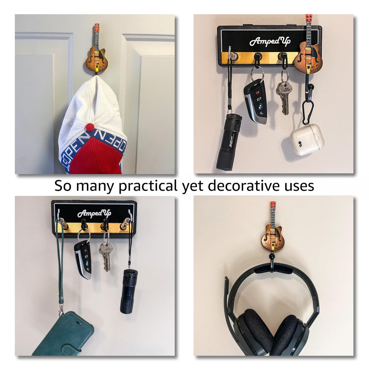 - Q: What is the Pick-a-Palooza Wall Mounted Guitar Amplifier Style Key Hanger? A: The Pick-a-Palooza Wall Mounted Guitar Amplifier Style Key Hanger is a multifunctional key and accessory holder designed to resemble a miniature guitar amplifier. It includes amp plug keychains, c-hooks for hanging various items, and a mini guitar hook that can be mounted on the wall or plugged directly into the amp.