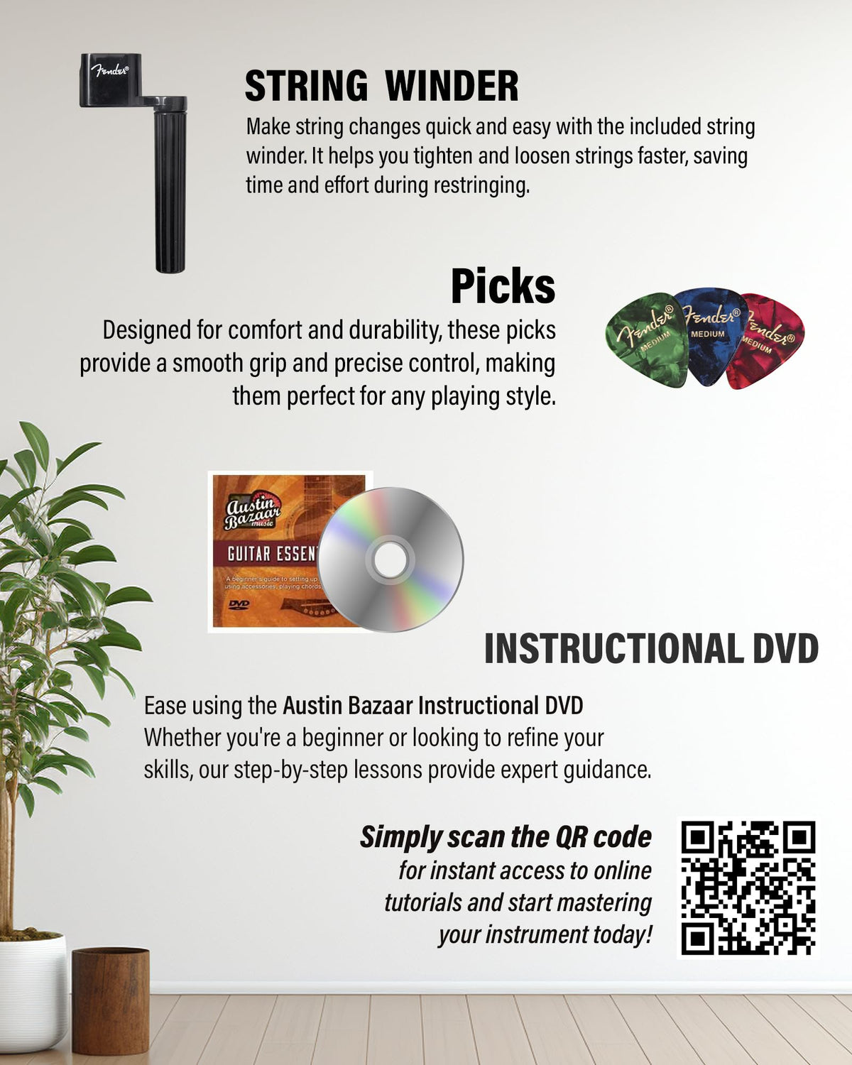 - Q: What accessories are included in the Fender Redondo Mini Acoustic Guitar Bundle? A: The bundle includes a gig bag, strap, clip-on tuner, extra strings, a string winder, picks, and an Austin Bazaar instructional DVD.
