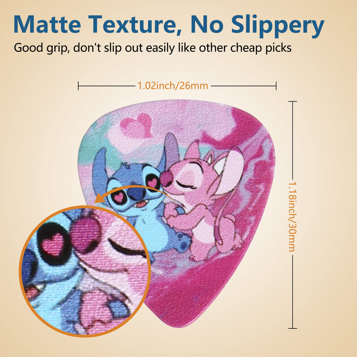 - Q: What designs do the guitar picks feature? A: The picks feature 6 cute and funny kawaii cartoon designs.
