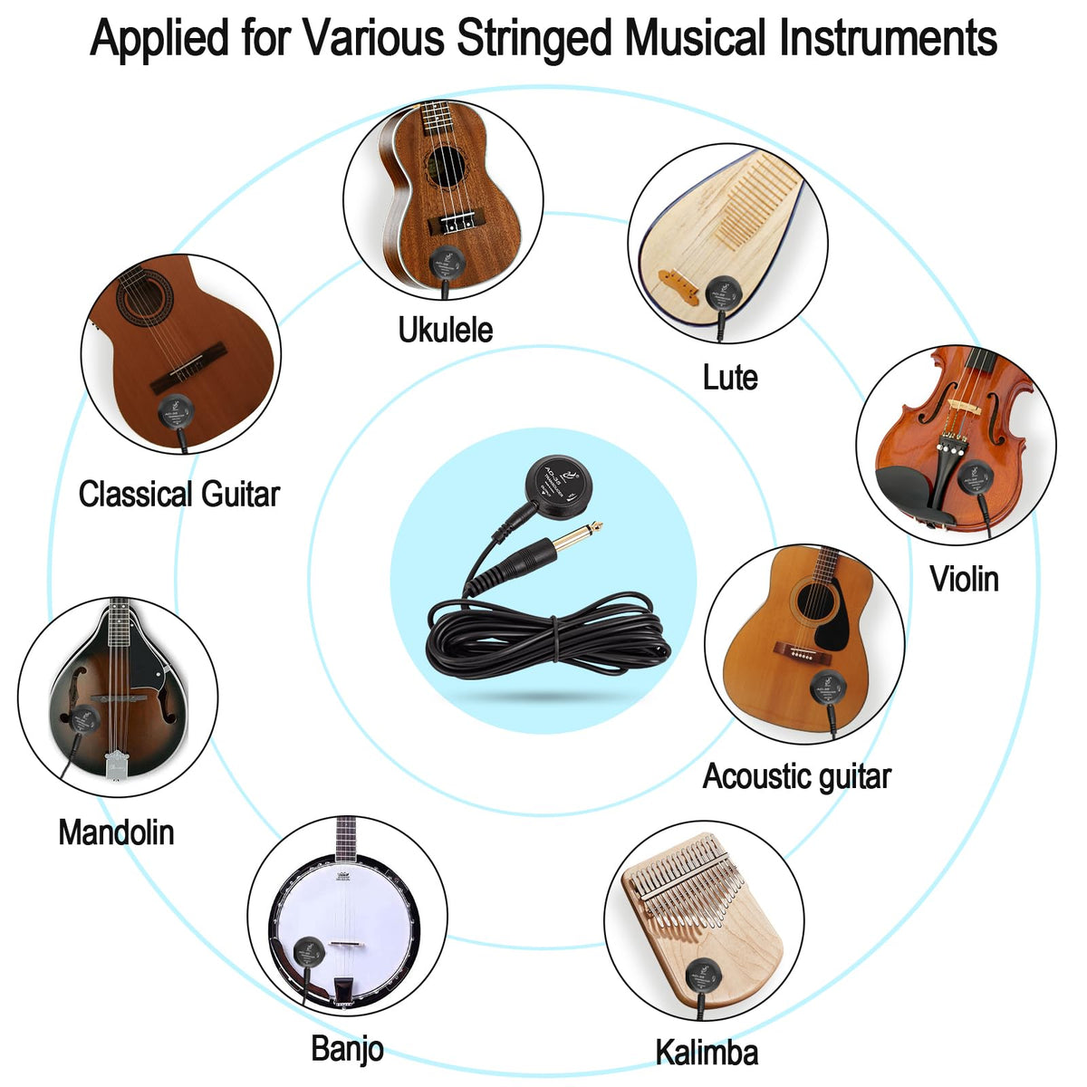 - Q: What instruments can the MUZTOP Guitar Pickup be used with? A: The MUZTOP Guitar Pickup is versatile and can be used with various stringed instruments, including acoustic guitars, violins, mandolins, ukuleles, banjos, cellos, kalimbas, harps, and more.