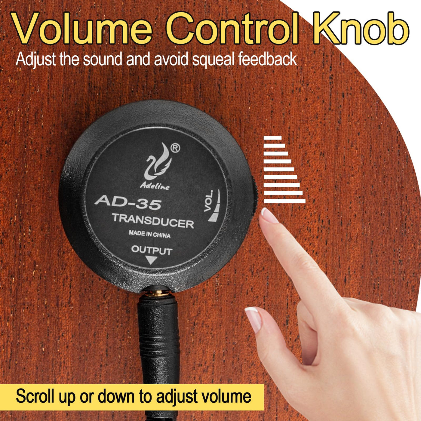 - Q: How does the volume control work on this pickup? A: The pickup features an adjustable volume control knob that allows you to determine the sound level before connecting to an amplifier, helping to avoid feedback.