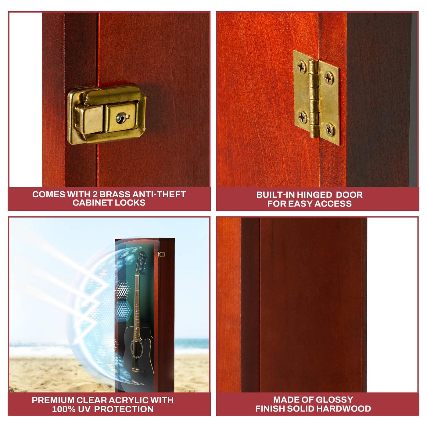 - Q: How does the display case secure the guitar? A: The case is equipped with two brass cabinet locks and keys, ensuring that your guitar is secure.