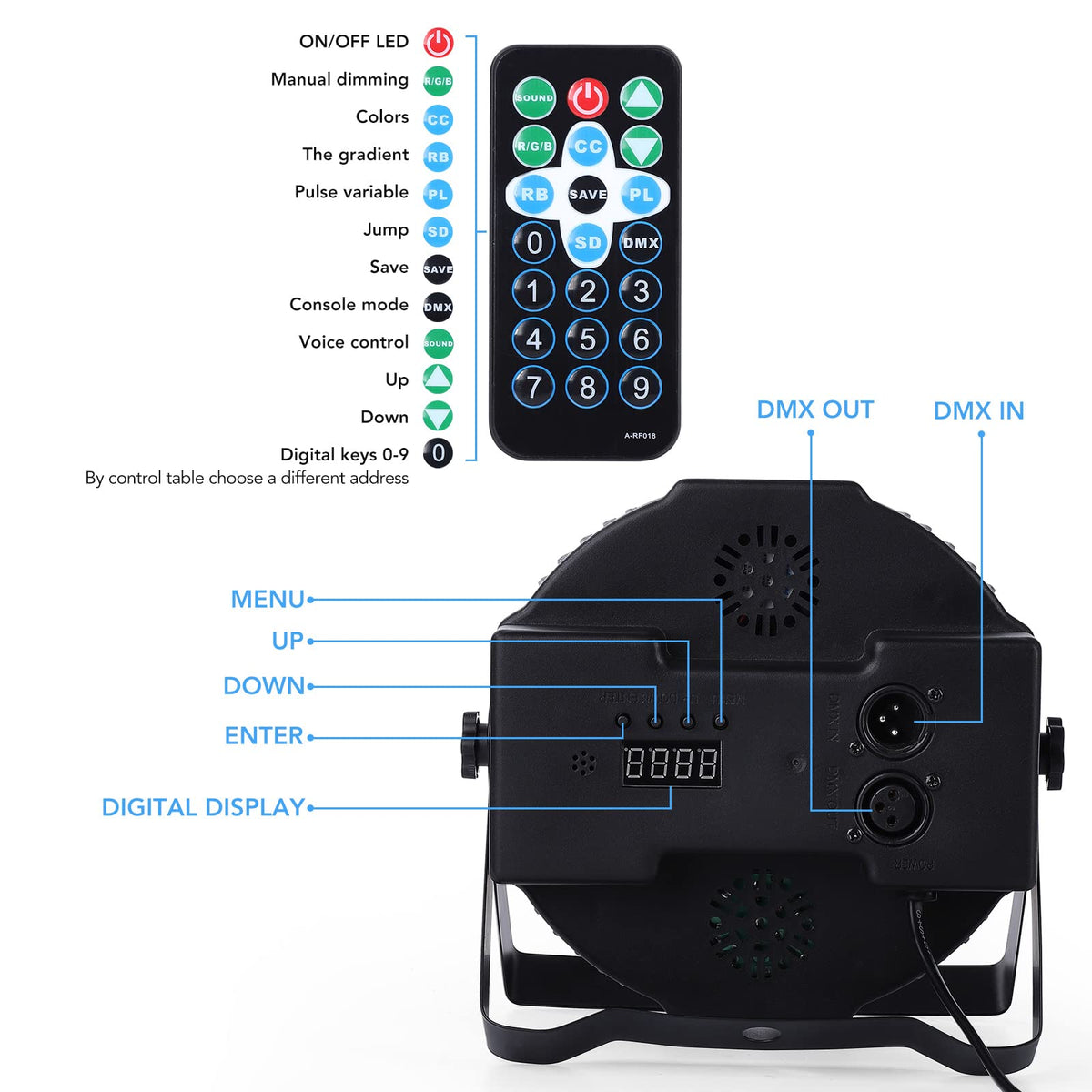 - Q: What lighting effects can these Par Lights produce? A: The Par Lights can produce multiple lighting effects, including color jumping, gradual color change, static colors, and strobe effects.