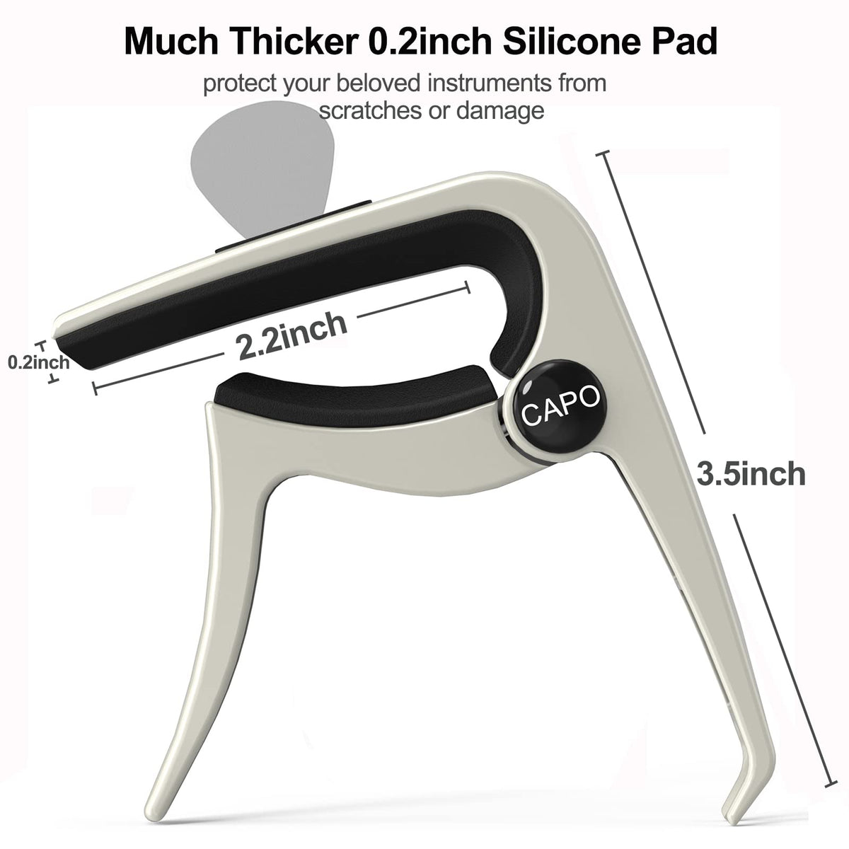 - Q: Does this capo cause any buzzing or scratching on the guitar? A: No, the capo is designed with a thicker 5mm silicone pad that protects your guitar from scratches and damage while providing even pressure across the strings for enhanced tuning stability.
