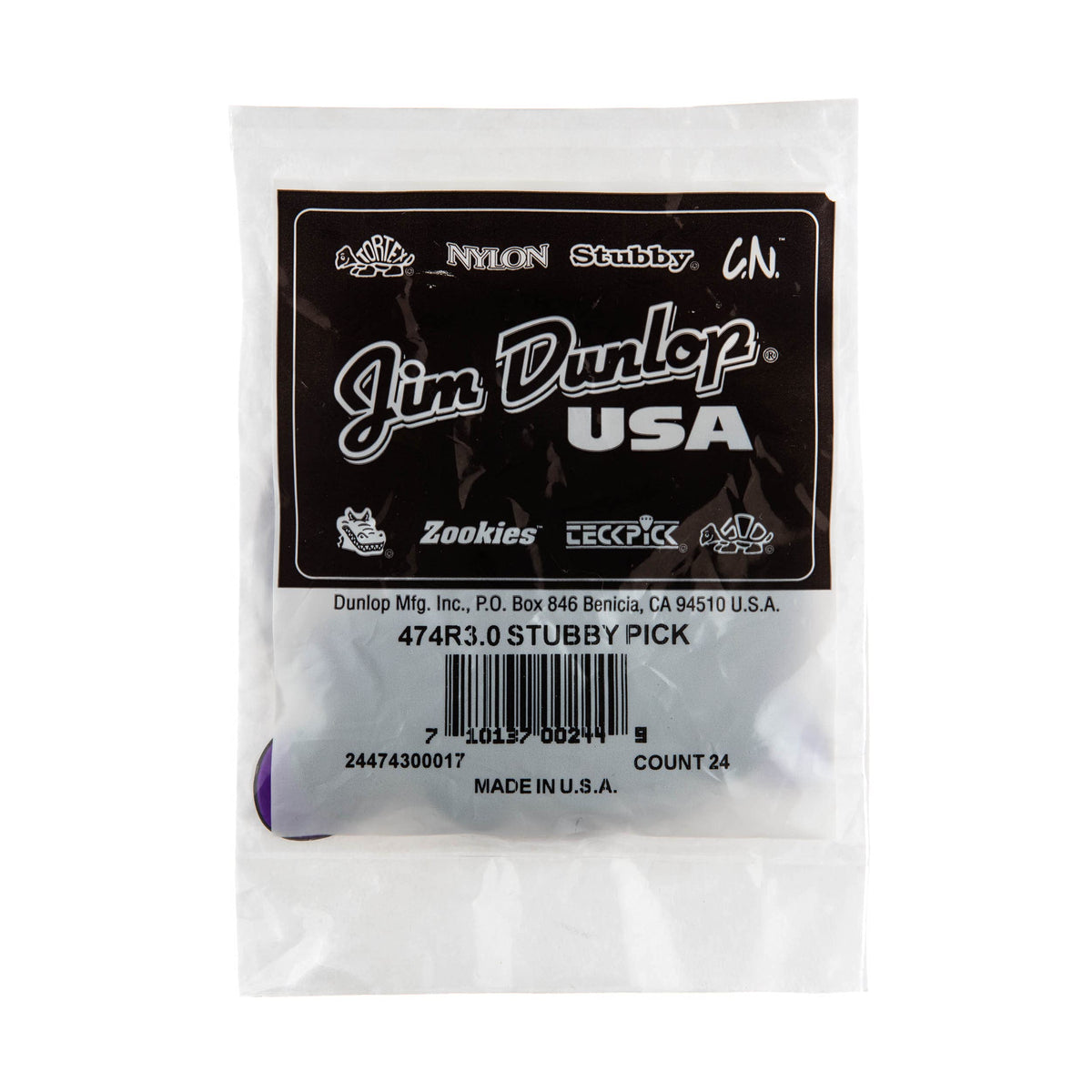 • Q: How many picks are included in each bag? A: Each bag contains 24 JIM DUNLOP 474R3.0 Stubby picks.