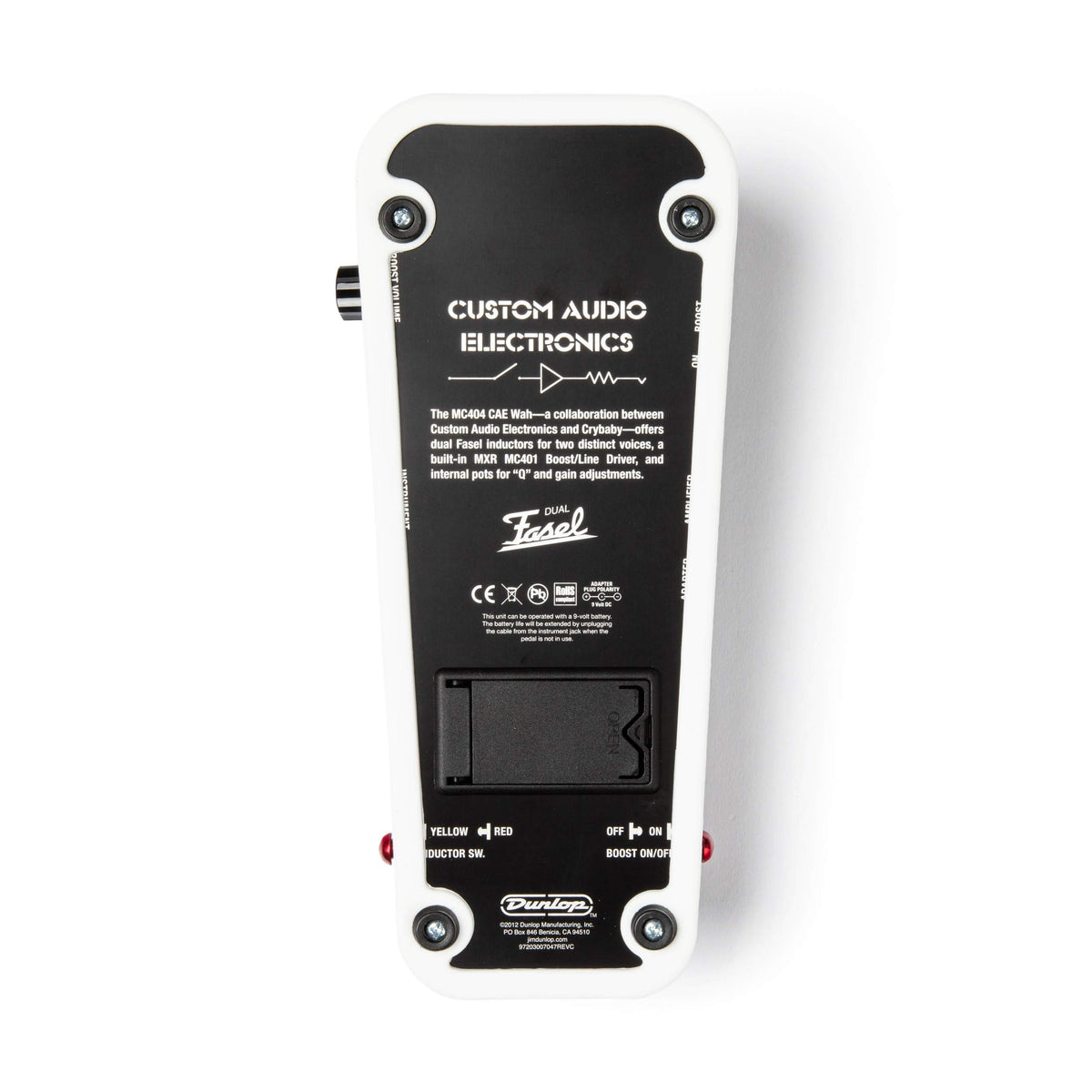 • Q: What are the key features of the JIM DUNLOP MC404 CAE Custom Audio Electronic Wah? A: The JIM DUNLOP MC404 features selectable yellow and red Fasel inductors for distinct tones, a custom-designed CTS low noise potentiometer, user-selectable gain output, low noise Class 'A' operational amplifiers, and bright LEDs for effect status and mode indication.