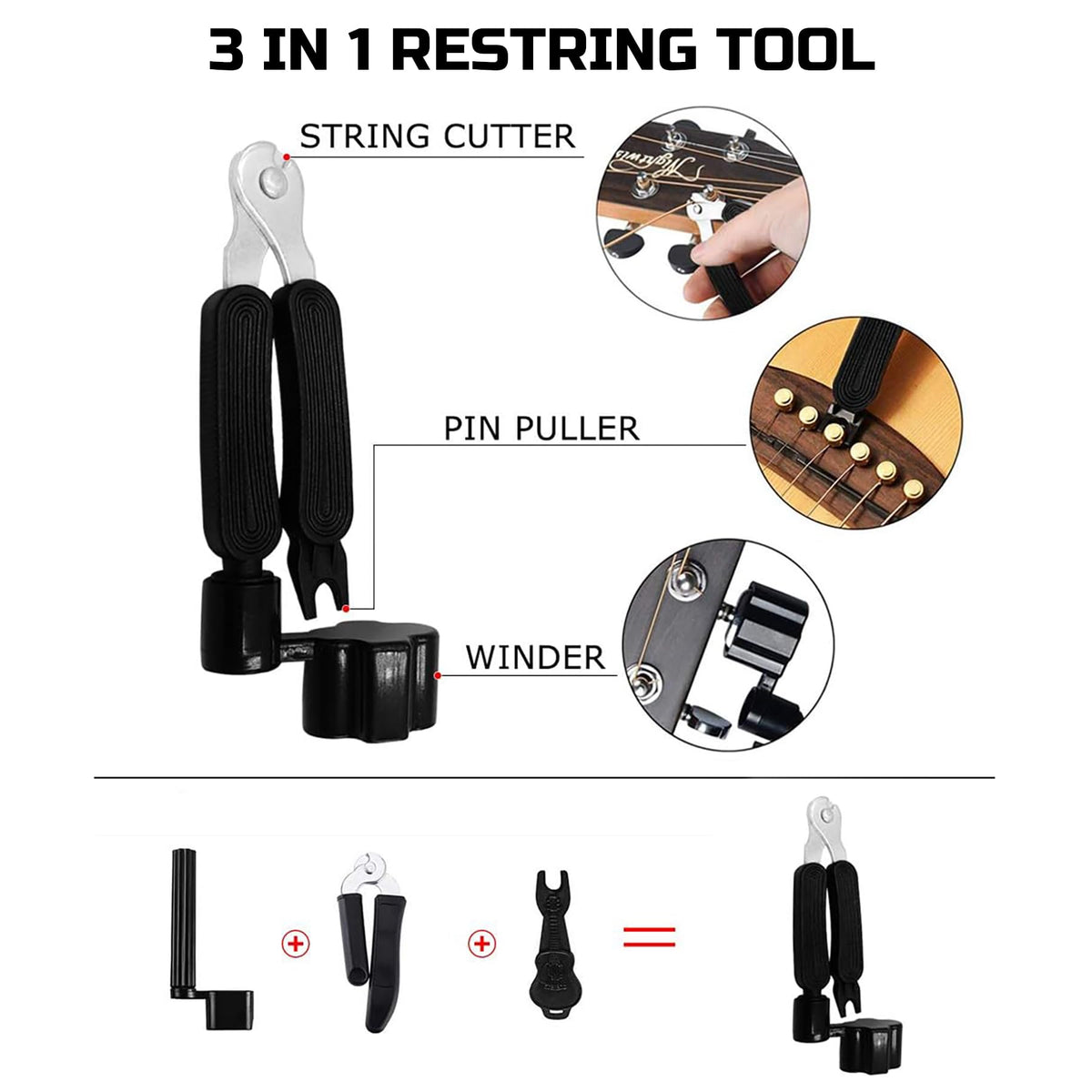 - Q: How does the 3-in-1 restring tool work? A: The 3-in-1 restring tool features a string winder, string cutter, and bridge pin puller, making the process of restringing your guitar quick and efficient.