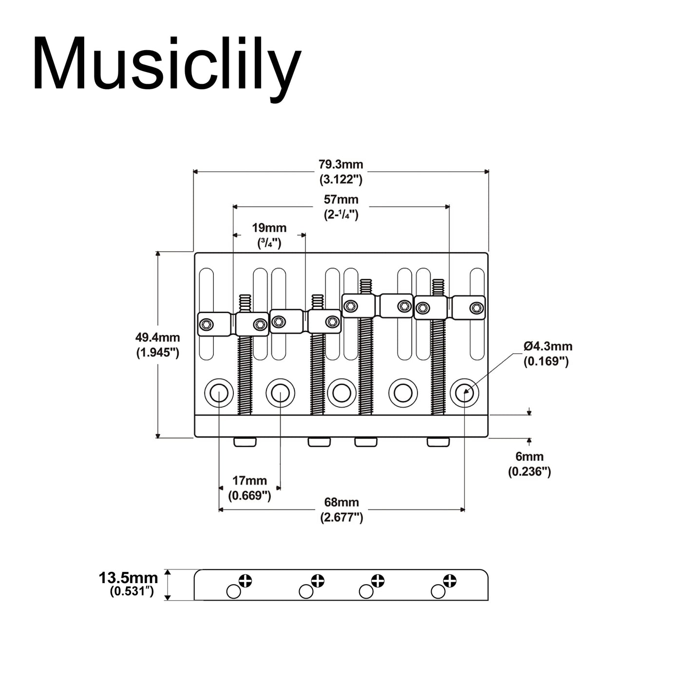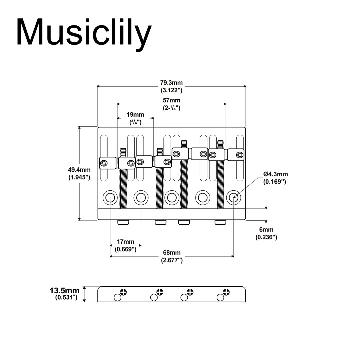 • Q: What is the string spacing of this bass bridge? A: The string spacing for the Musiclily bass bridge is 57mm (2-1/4 inches).
