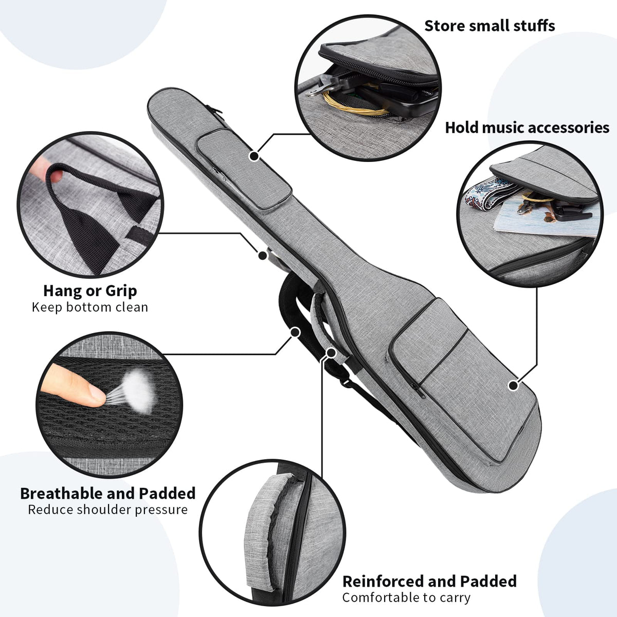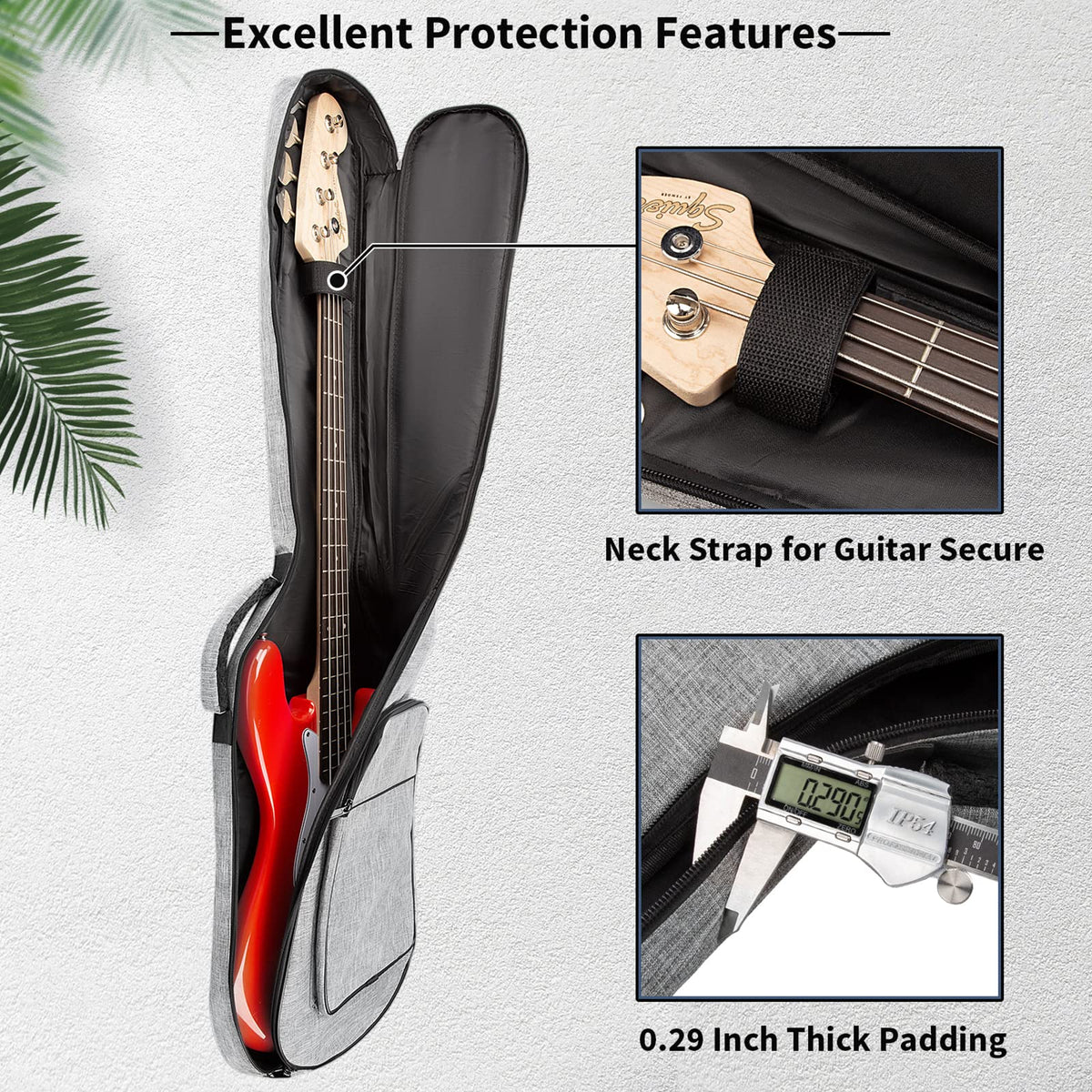 MUZTOP Bass Guitar Bag, 7MM Padding Bass Guitar Gig Bag Padded Soft Electric Bass Guitar Case Backpack with Pockets, Grey