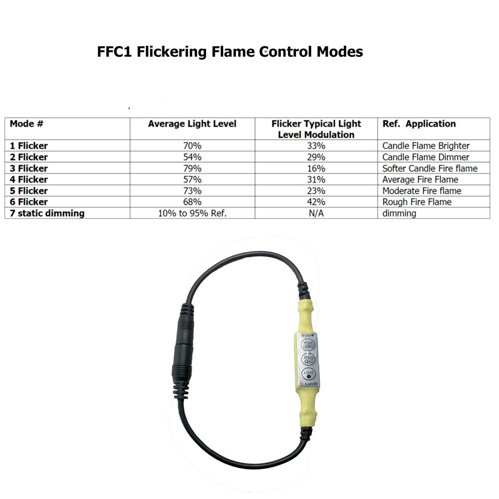 This kit consists of three Micro Effects Lights, flame orange light output in a narrow beam pattern, a 3-way Pigtail Connector Splitter, a Flicker Flame Control, and a 9-volt battery clip. This kit is a small flicker flame light for building props, scenery and costumes. The kit can operate from a 12-volt DC or 9-volt DC power supply. The power of the 3 lights at 12-volts DC is 90ma nominal current, 1.1 watts, and the power at 9-volts DC is 66ma nominal current, 0.6 watts. The kit can also operate from a 9-volt battery. When operated from a new 9V alkaline battery, the operating time can be expected to be about 3 hours typical. The highest light output is achieved when operating from 12 volts DC. The Micro Effects Light heads are 1.42 inch nominal in length and 0.48 inch nominal in diameter. Each of 3 light heads has an overall length of six inches from the 3-way cable splitter. The overall length of the lights, cable splitter, and control is 26.5 inches nominal. The 9-volt battery clip wires are 5 inches in length nominal. The flicker flame control has 6 flicker modes and adjustable speed steps. The control retains the last settings used when power is disconnected from the control and reconnected. Idle current of the control when it is off is typically 10ma or less. Disconnect batteries when not in use to preserve battery life. Center button is dual function, fast clicks changes speed, hold 3-5 seconds to turn on and off. The kit components uses DC barrel connectors of the 2.1mm x 5.5mm size with center positive polarity. Batteries are not included. Power supply not included. Applications: Building prop theatrical torches Flame effects for prop lanterns Simulation of small fires in themed entertainment projects Fire effects for theatrical costumes
