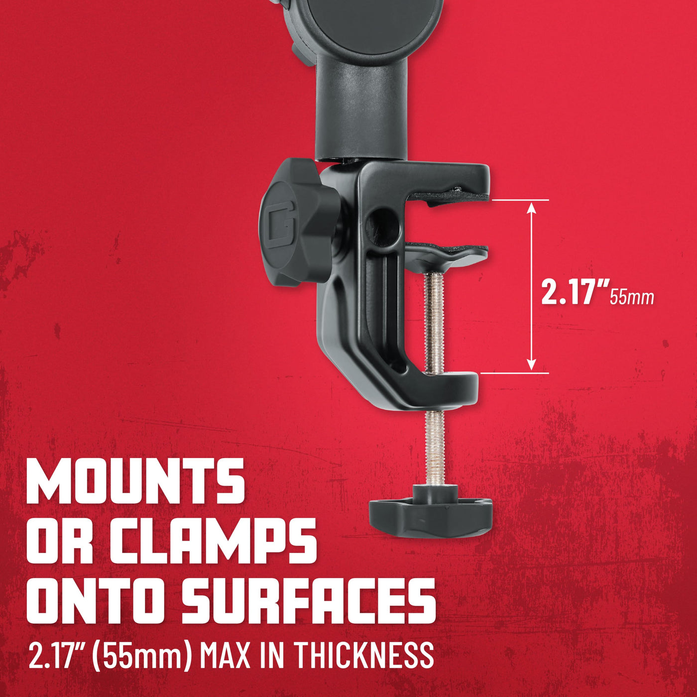 - Q: How does the boom stand attach to surfaces? A: The boom stand can easily clamp or mount directly to desks, tables, and similar-sized surfaces up to 2.17 inches (55 mm) in thickness.