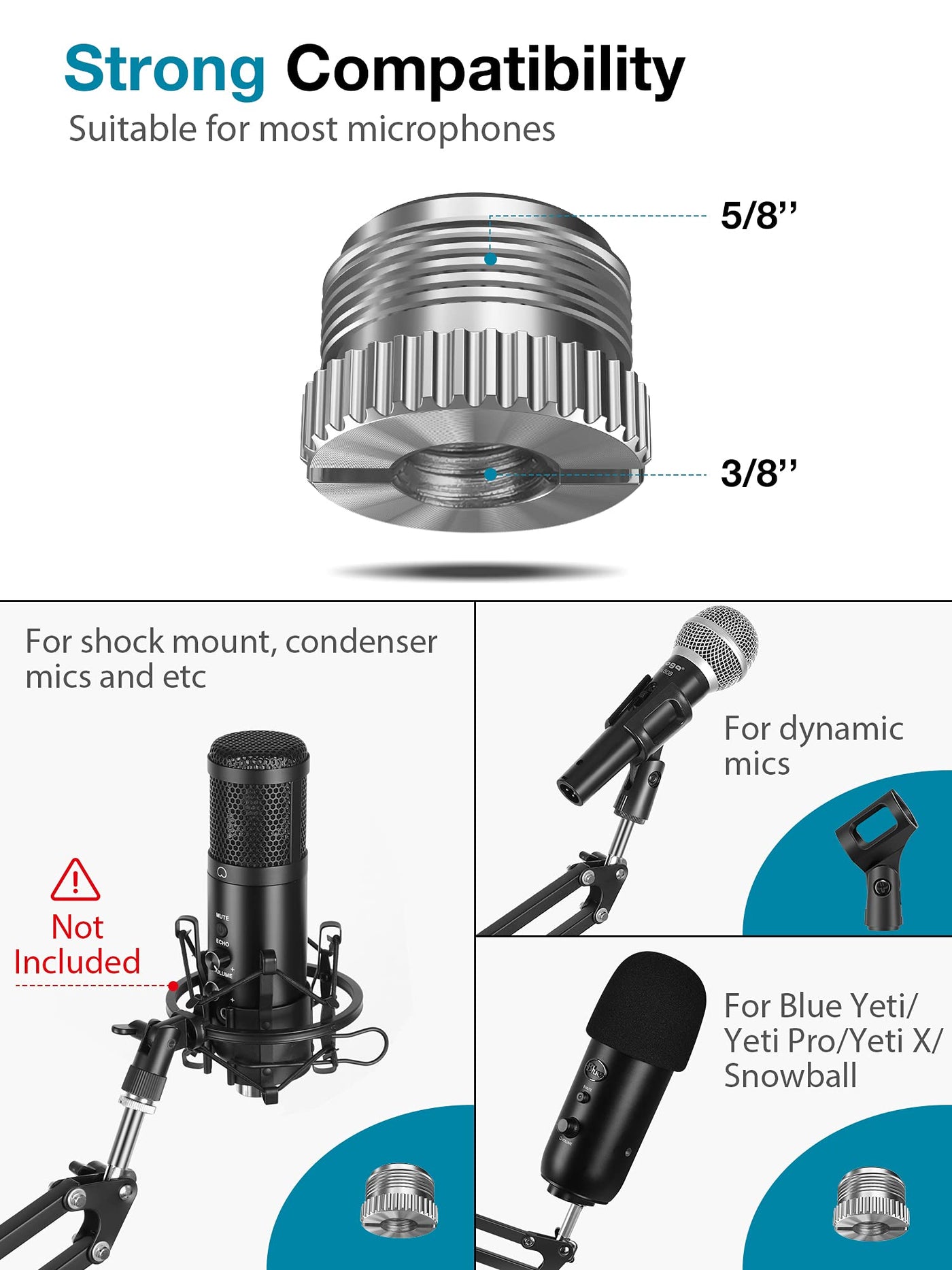 - Q: Is the InnoGear Microphone Arm compatible with Blue Yeti microphones? A: Yes, the microphone arm is compatible with Blue Yeti microphones and includes a 3/8" to 5/8" screw adapter for easy attachment.