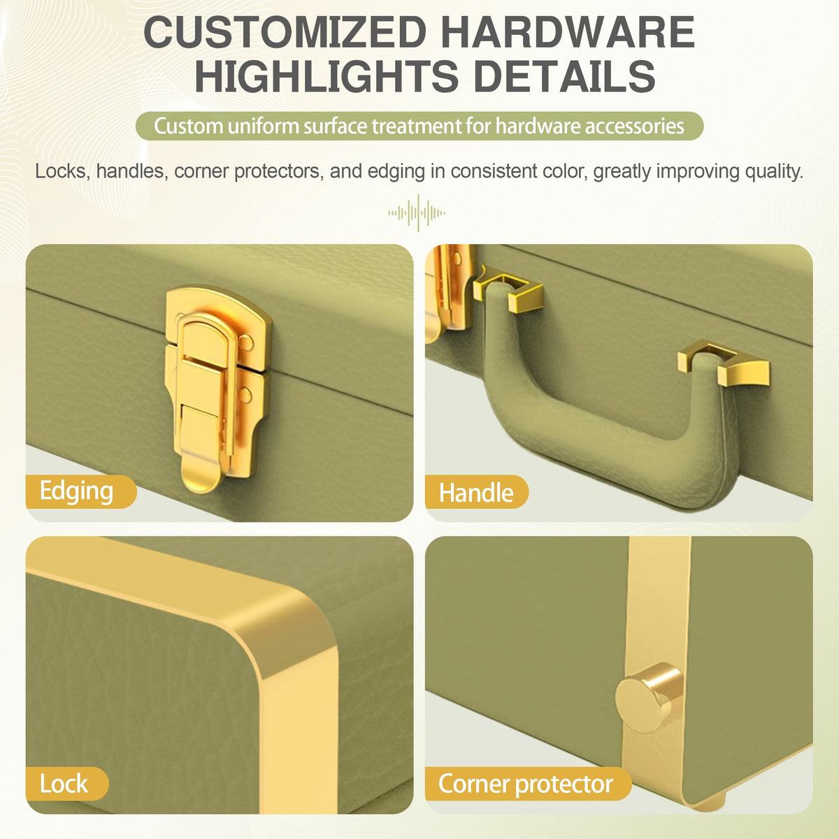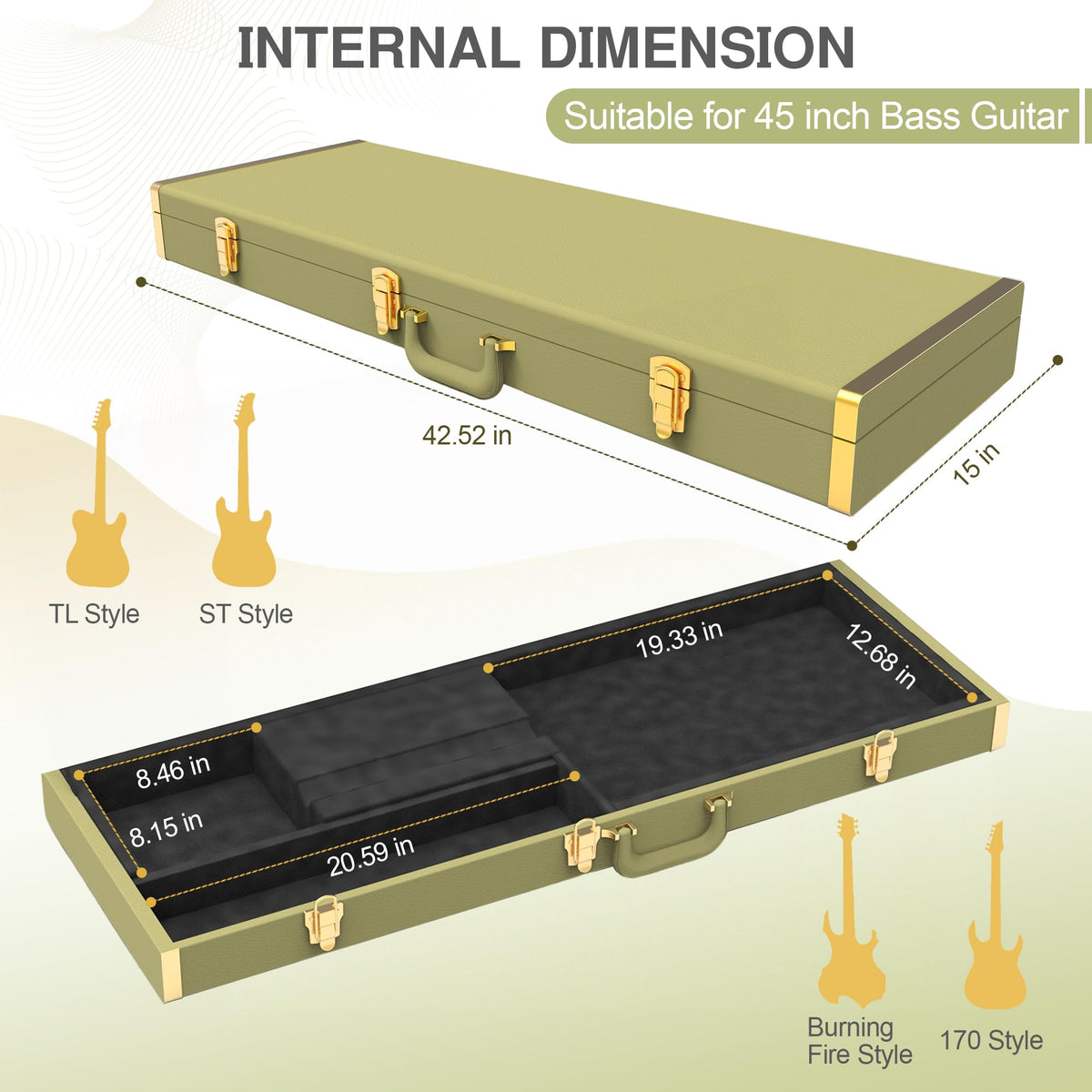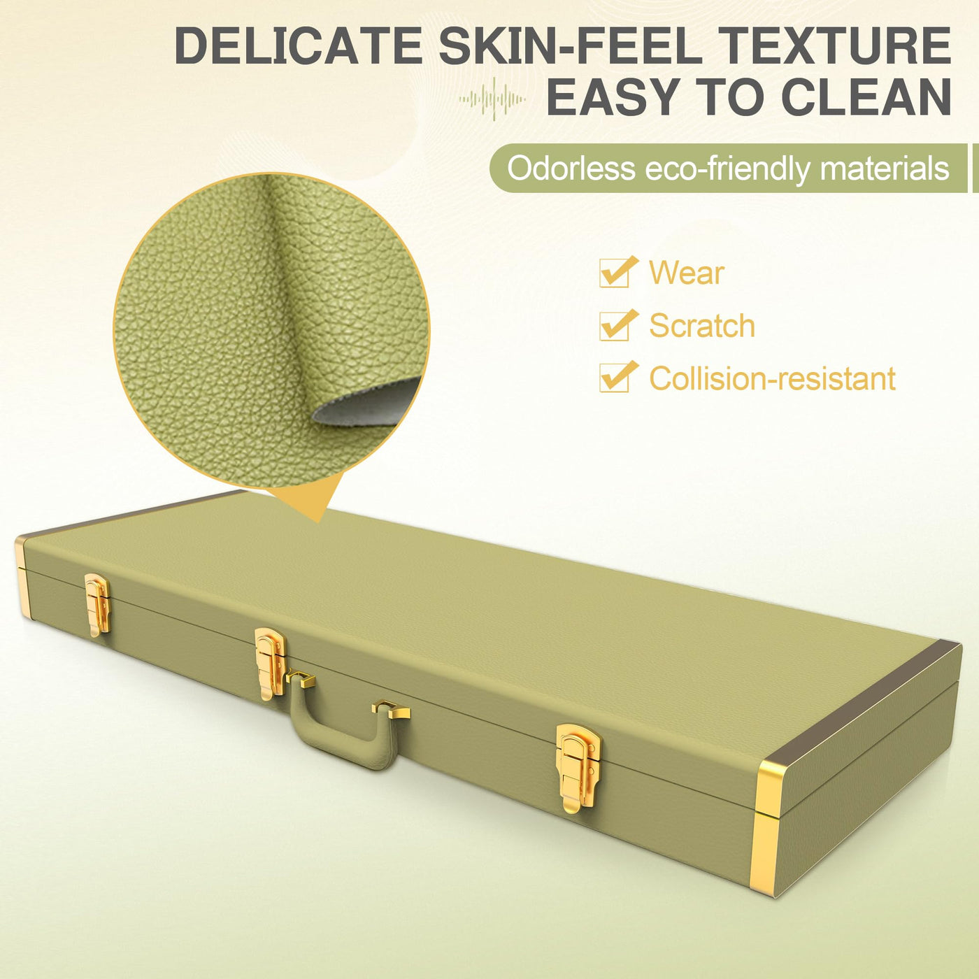 • Q: What materials is the guitar case made from? A: The case features a high-quality pine wooden structure with a durable leather exterior, providing both protection and an elegant appearance.